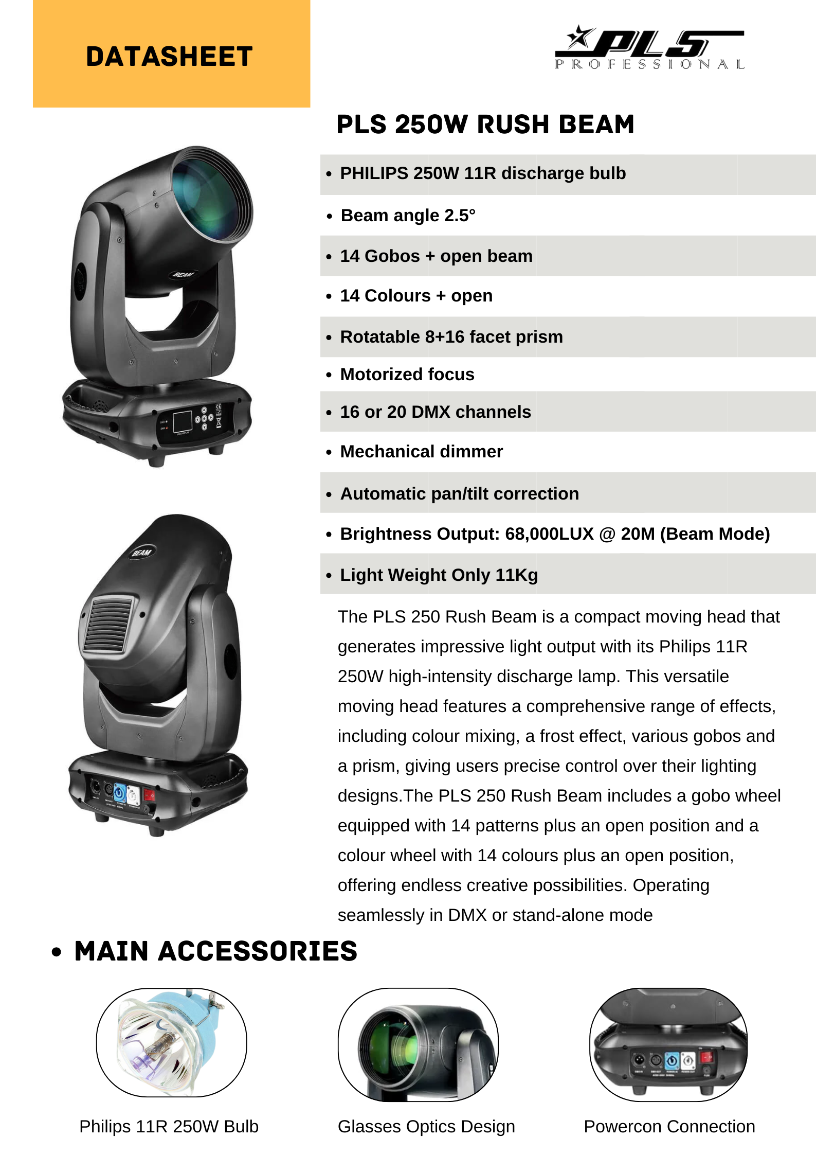 The PLS 250 Rush Beam is a compact moving head that generates impressive light output with its Philips 11R 250W high-intensity discharge lamp. This versatile moving head features a comprehensive range of effects, including colour mixing, a frost effect, various gobos and a prism, giving users precise control over their lighting designs.The PLS 250 Rush Beam includes a gobo wheel equipped with 14 patterns plus an open position and a colour wheel with 14 colours plus an open position, offering endless creative possibilities. Operating seamlessly in DMX or stand-alone mode