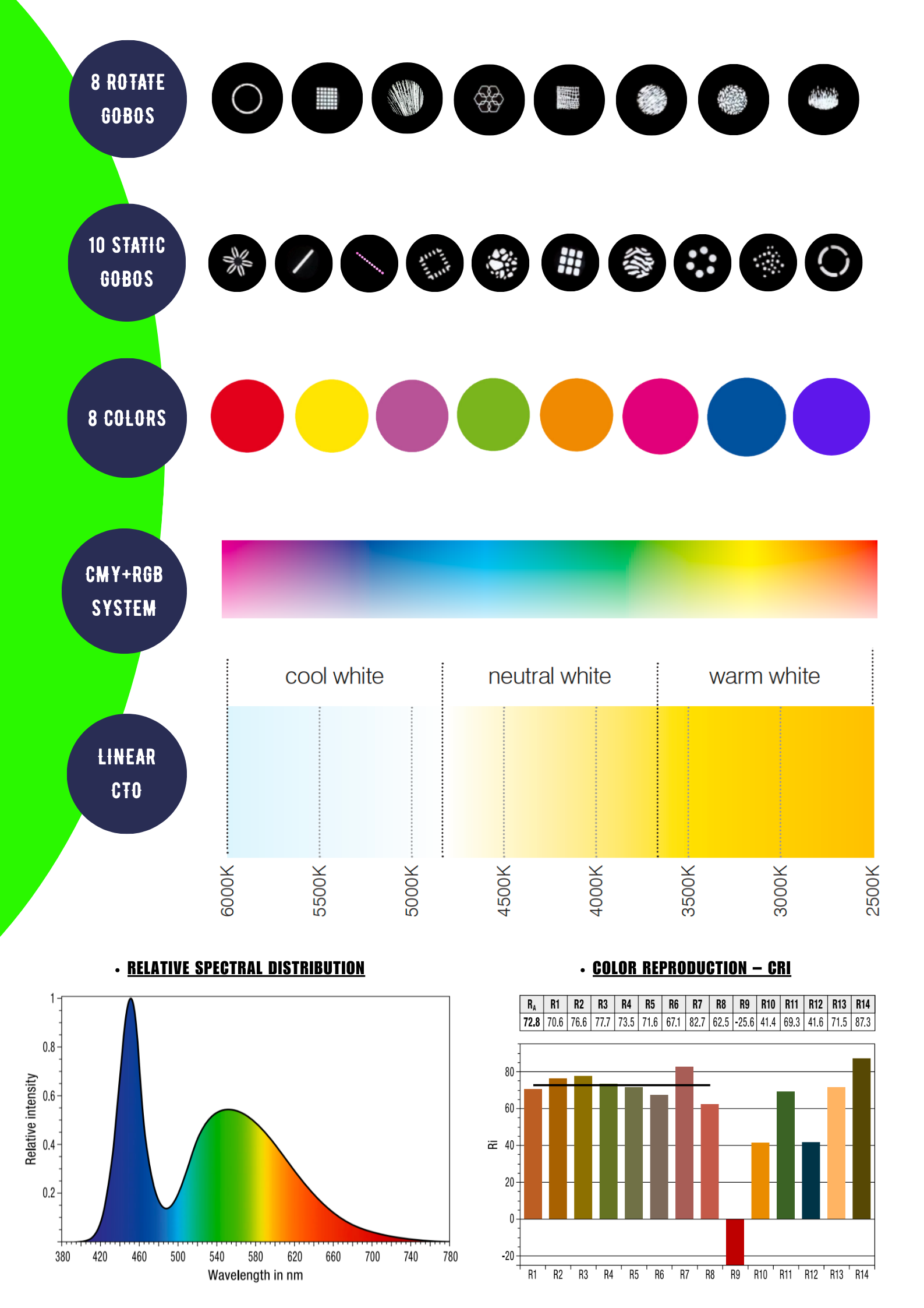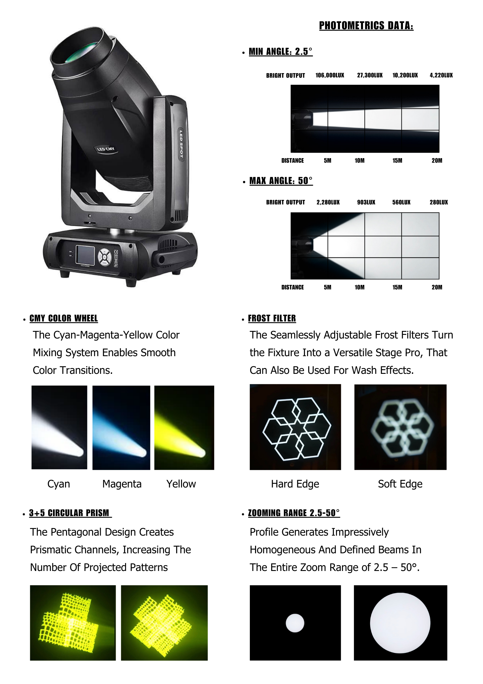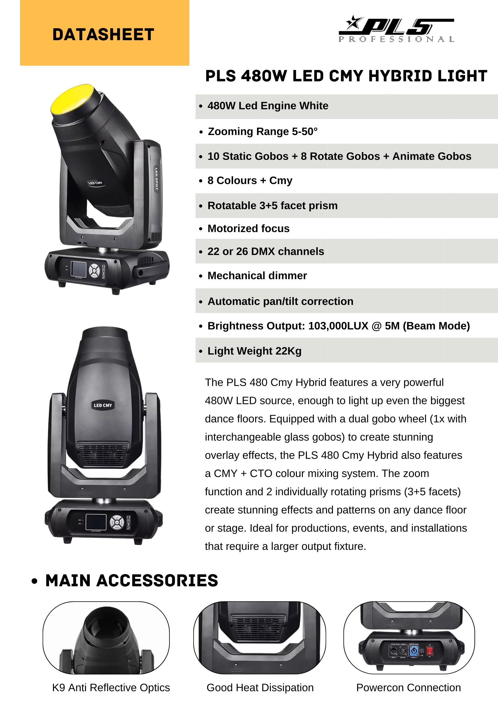 The PLS 480 Cmy Hybrid features a very powerful 480W LED source, enough to light up even the biggest dance floors. Equipped with a dual gobo wheel (1x with interchangeable glass gobos) to create stunning overlay effects, the PLS 480 Cmy Hybrid also features a CMY + CTO colour mixing system. The zoom function and 2 individually rotating prisms (3+5 facets) create stunning effects and patterns on any dance floor or stage. Ideal for productions, events, and installations that require a larger output fixture.