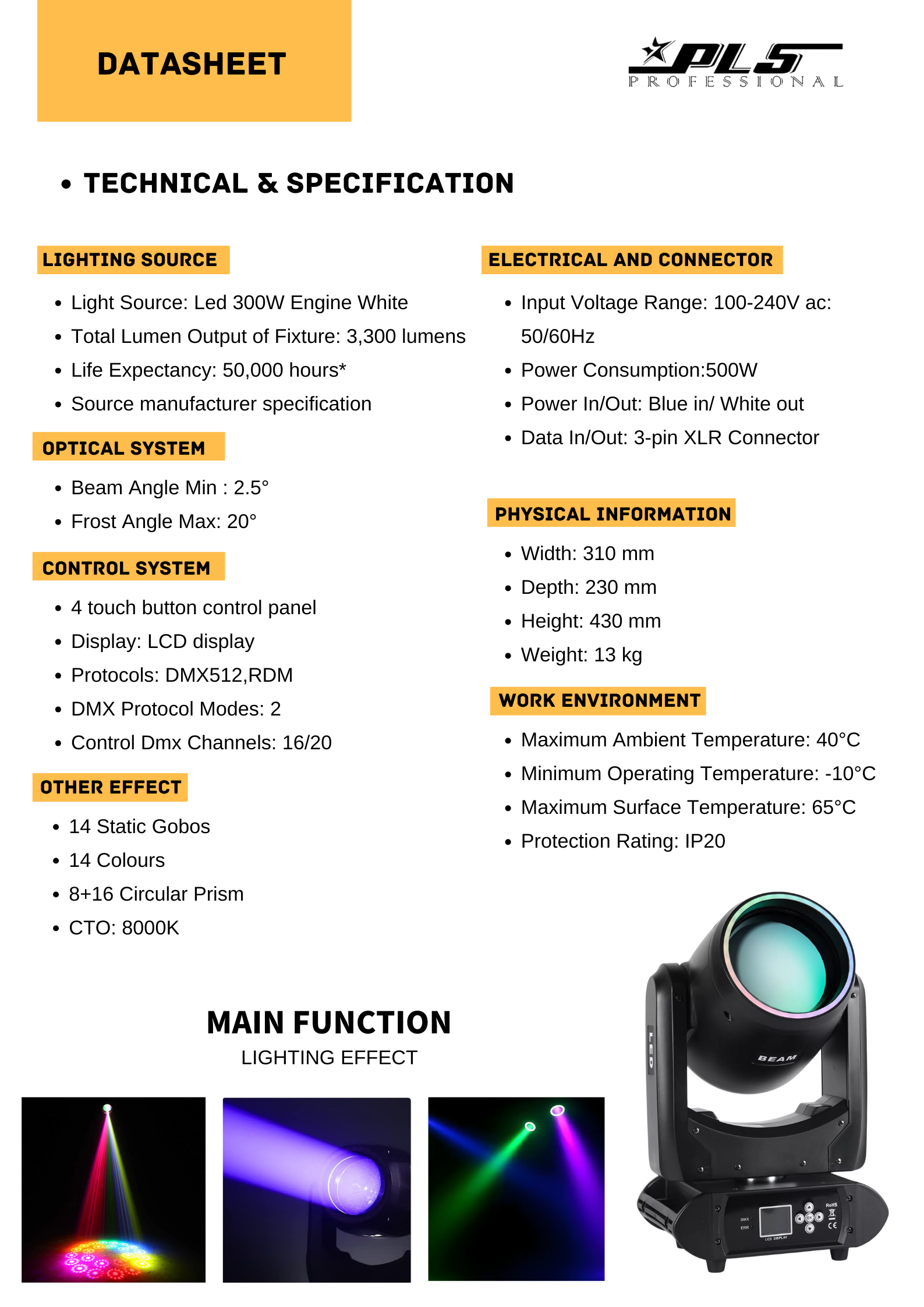 PIXEL BEAM 300 is small size and less than 500mm high. The motor use a three-phase motor, which has a fast and quieter movement . The beam angles as small as 2° and surprising light output, super-concentrated solid beam and matched with a circle of RGB strips light . Rich and high-quality color and circle led effects, electronic focus and a 152mm diameter front lens make the PIXEL BEAM 300 the ideal beam moving light for any application, the perfect replacement for the BEAM 230.