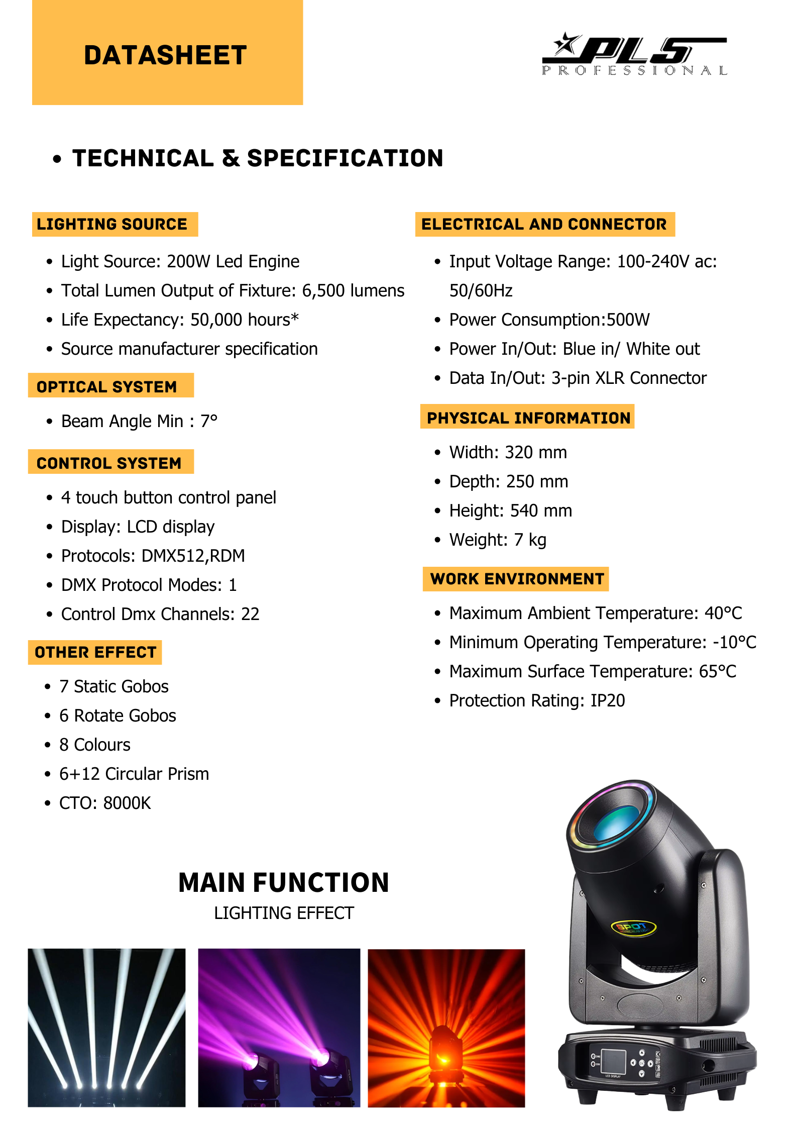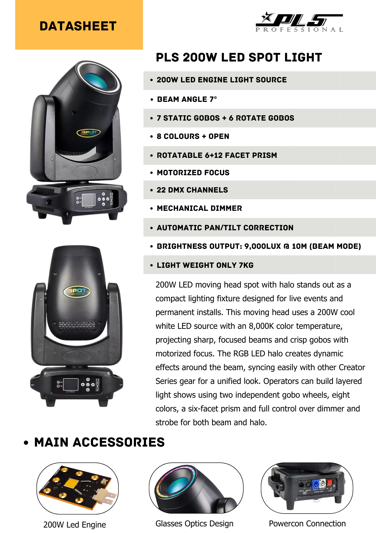 200W LED moving head spot with halo stands out as a compact lighting fixture designed for live events and permanent installs. This moving head uses a 200W cool white LED source with an 8,000K color temperature, projecting sharp, focused beams and crisp gobos with motorized focus. The RGB LED halo creates dynamic effects around the beam, syncing easily with other Creator Series gear for a unified look. Operators can build layered light shows using two independent gobo wheels, eight colors, a 6+12 facet prism and full control over dimmer and strobe for both beam and halo.
