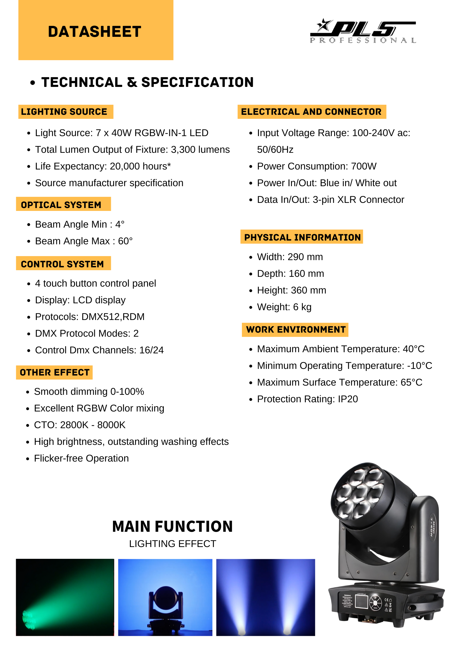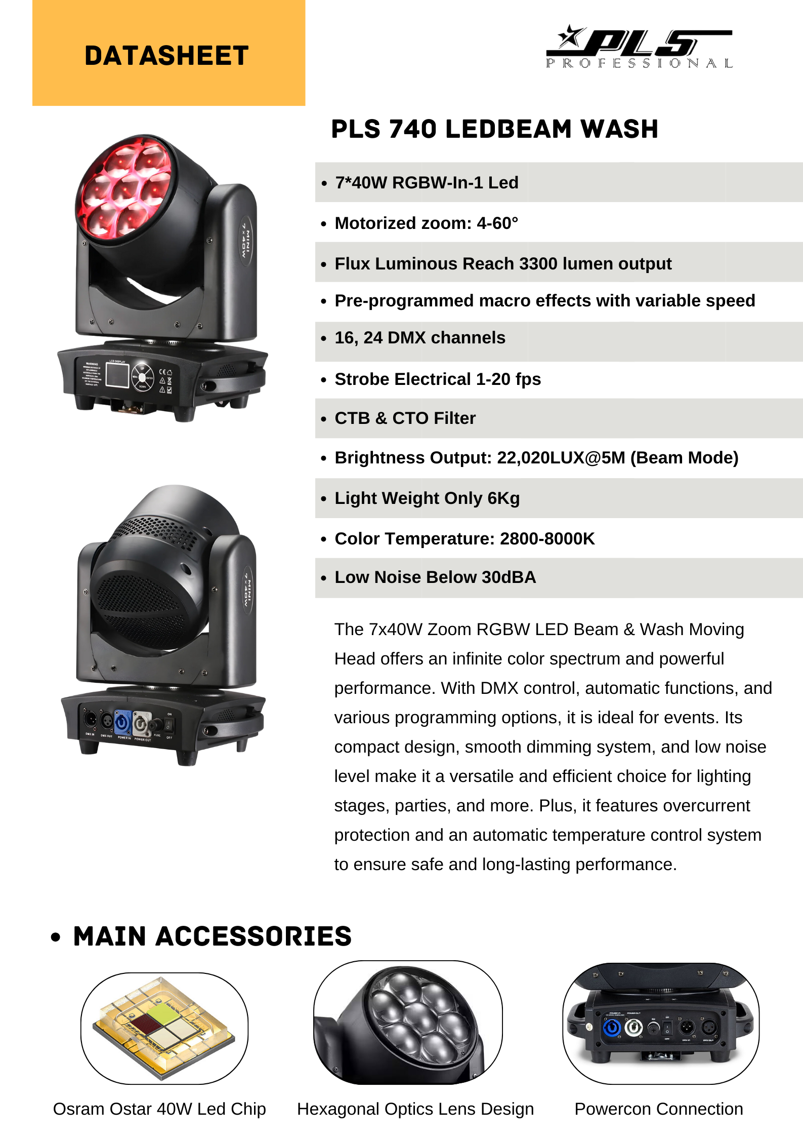 The 7x40W Zoom RGBW LED Beam & Wash Moving Head offers an infinite color spectrum and powerful performance. With DMX control, automatic functions, and various programming options, it is ideal for events. Its compact design, smooth dimming system, and low noise level make it a versatile and efficient choice for lighting stages, parties, and more. Plus, it features overcurrent protection and an automatic temperature control system to ensure safe and long-lasting performance.