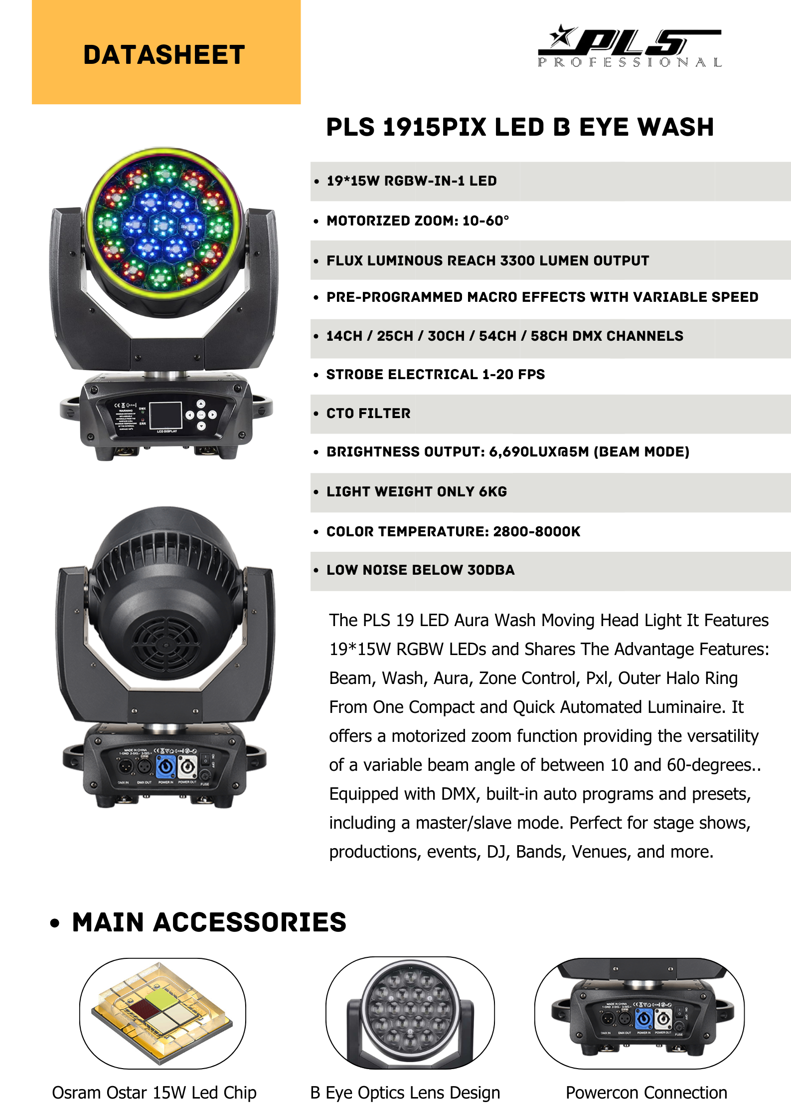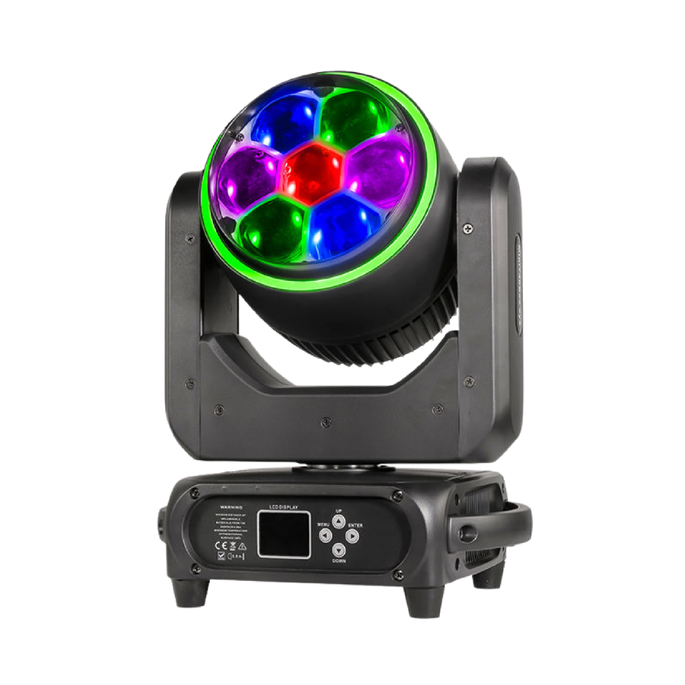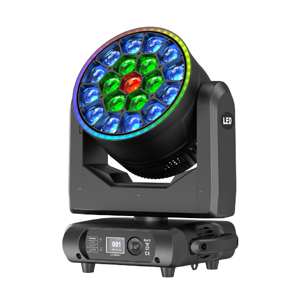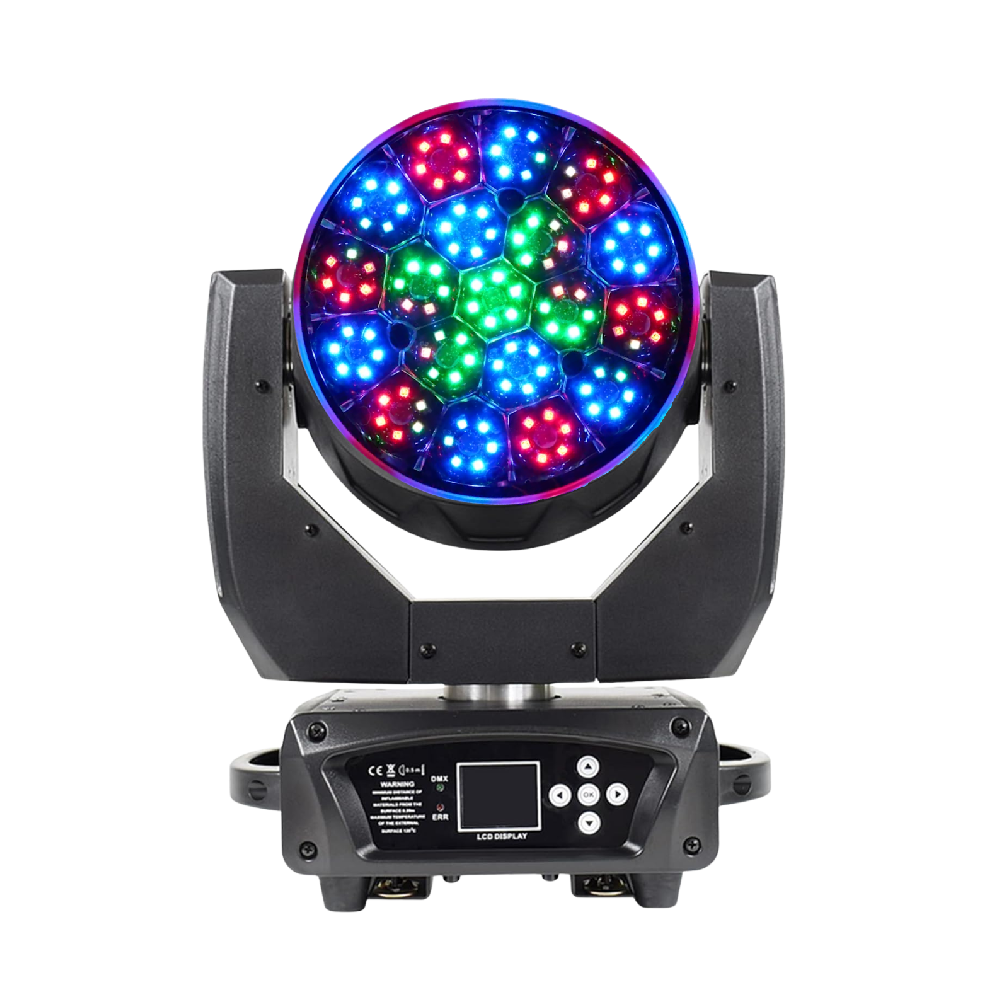 The PLS 19 LED Aura Wash Moving Head Light It Features 19*30W RGBL LEDs and Shares The Advantage Features: Beam, Wash, Aura, Zone Control, Outer Halo Ring From One Compact and Quick Automated Luminaire. It offers a motorized zoom function providing the versatility of a variable beam angle of between 10 and 60-degrees.. Equipped with DMX, built-in auto programs and presets, including a master/slave mode. Perfect for stage shows, productions, events, DJ, Bands, Venues, and more.