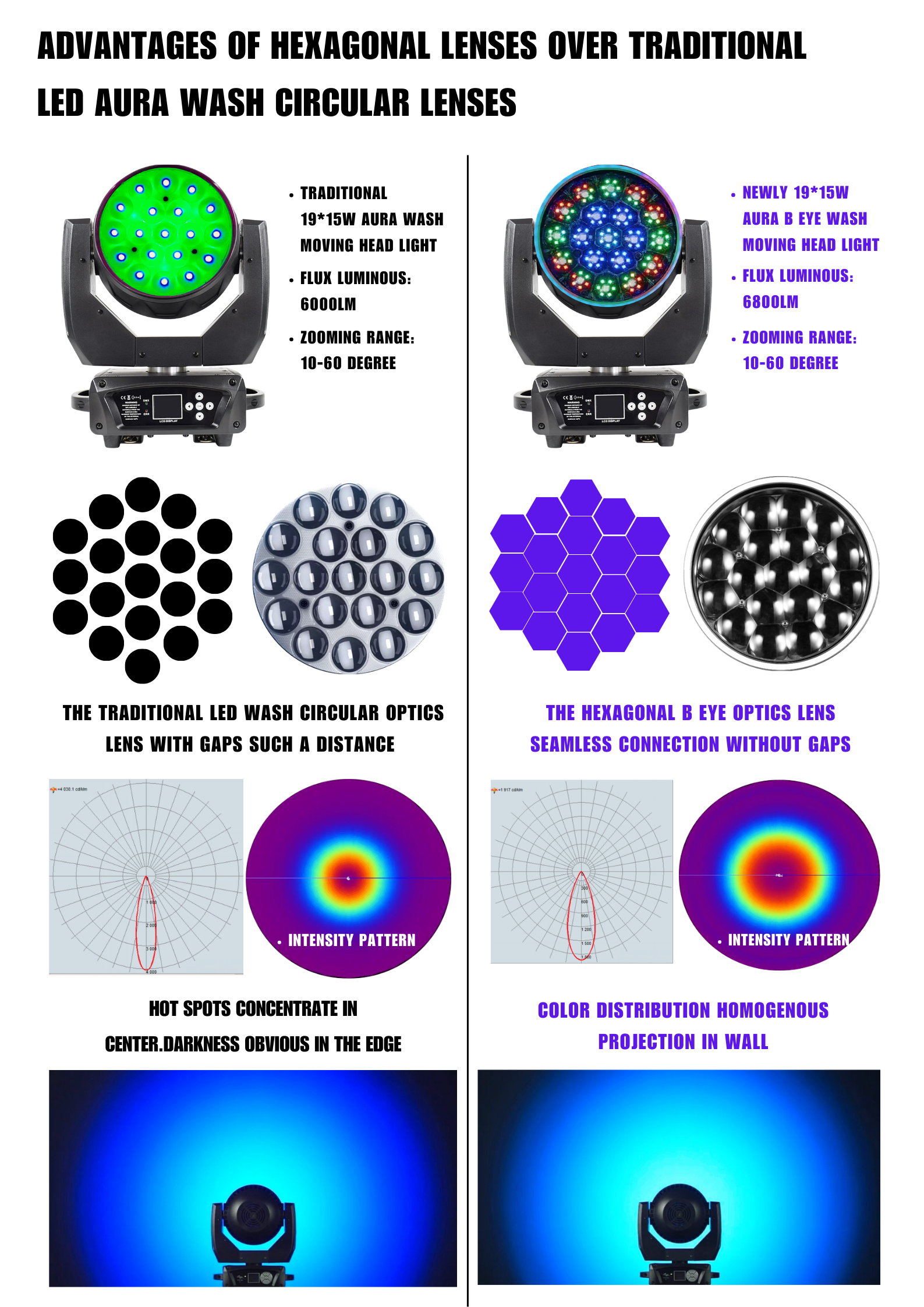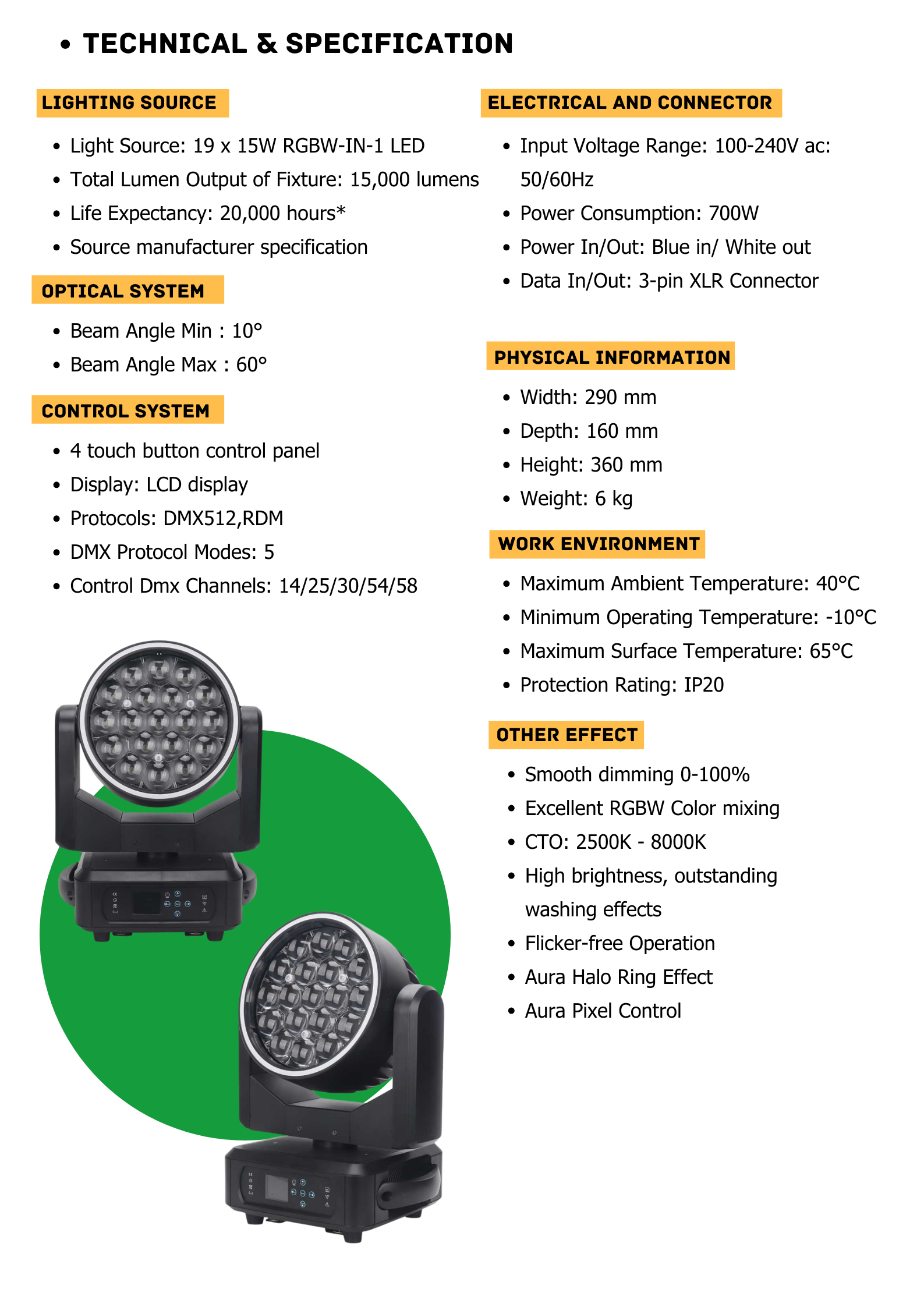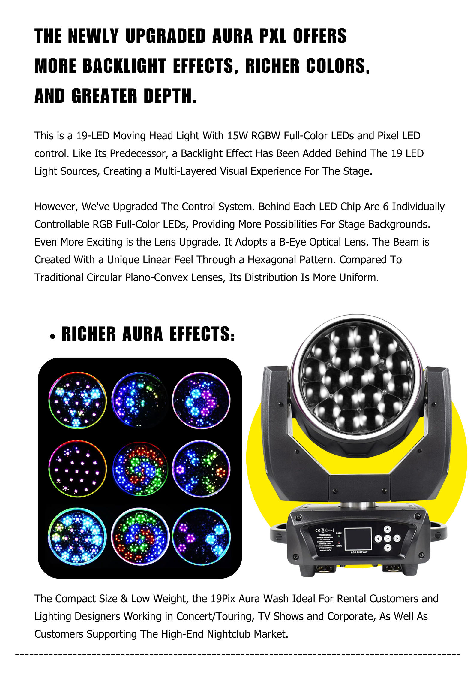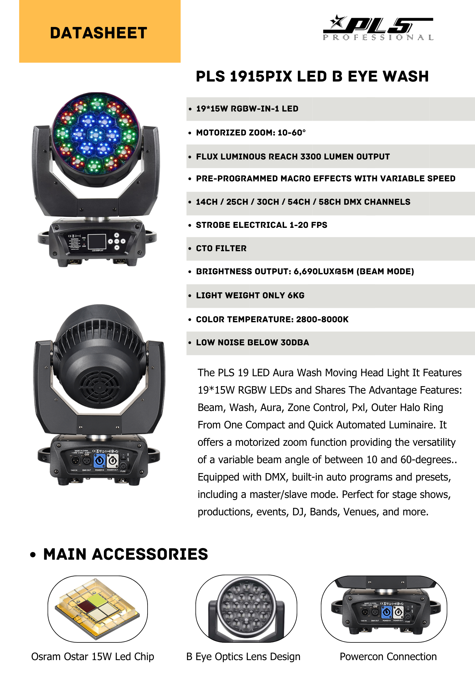 The PLS 19 LED Aura Wash Moving Head Light It Features 19*30W RGBL LEDs and Shares The Advantage Features: Beam, Wash, Aura, Zone Control, Outer Halo Ring From One Compact and Quick Automated Luminaire. It offers a motorized zoom function providing the versatility of a variable beam angle of between 10 and 60-degrees.. Equipped with DMX, built-in auto programs and presets, including a master/slave mode. Perfect for stage shows, productions, events, DJ, Bands, Venues, and more.