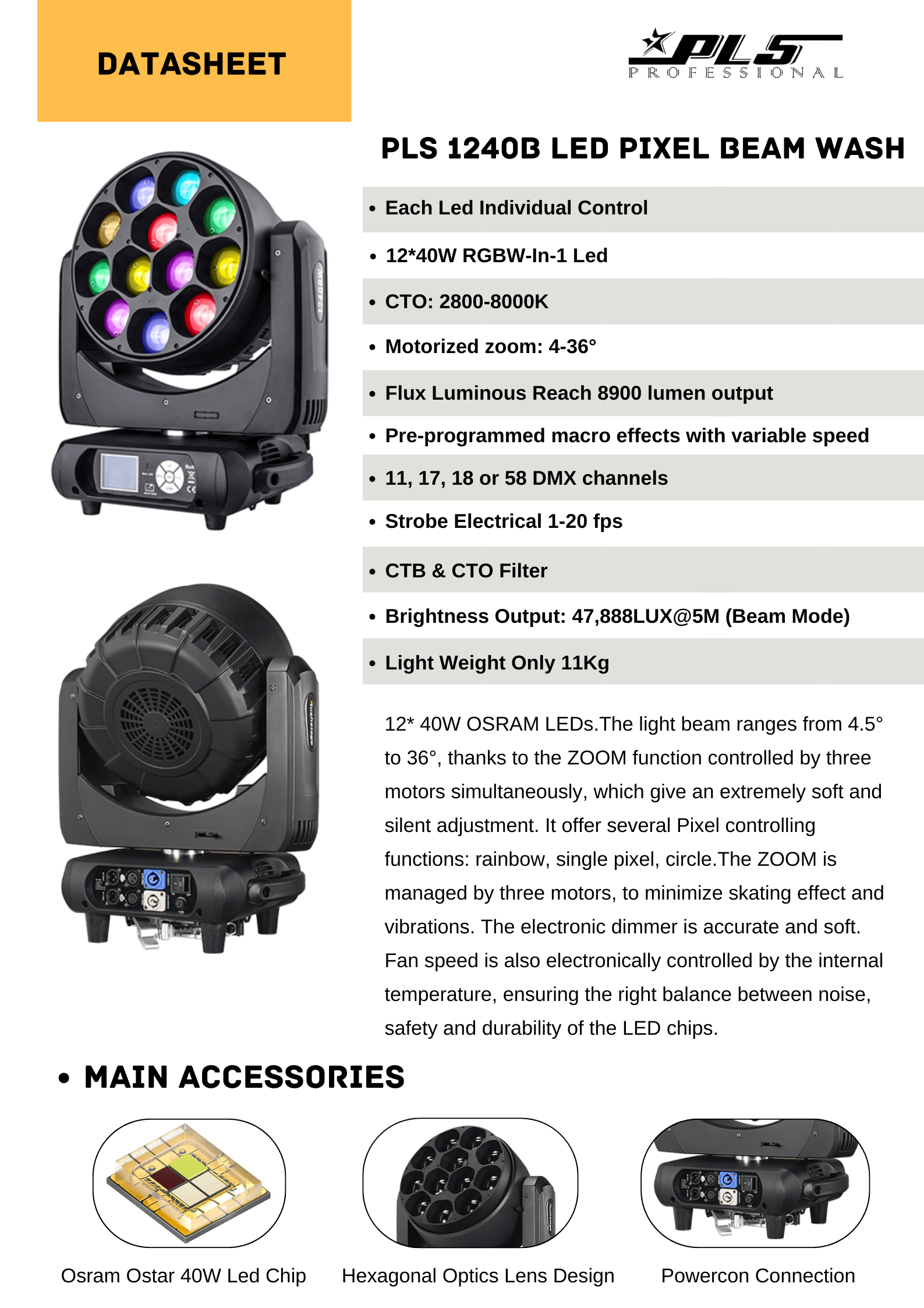 12* 40W OSRAM LEDs.The light beam ranges from 4.5° to 36°, thanks to the ZOOM function controlled by three motors simultaneously, which give an extremely soft and silent adjustment. It offer several Pixel controlling functions: rainbow, single pixel, circle.The ZOOM is managed by three motors, to minimize skating effect and vibrations. The electronic dimmer is accurate and soft. Fan speed is also electronically controlled by the internal temperature, ensuring the right balance between noise, safety and durability of the LED chips.