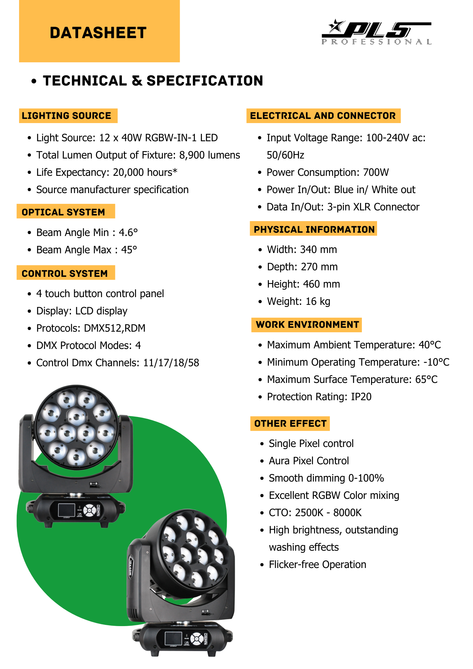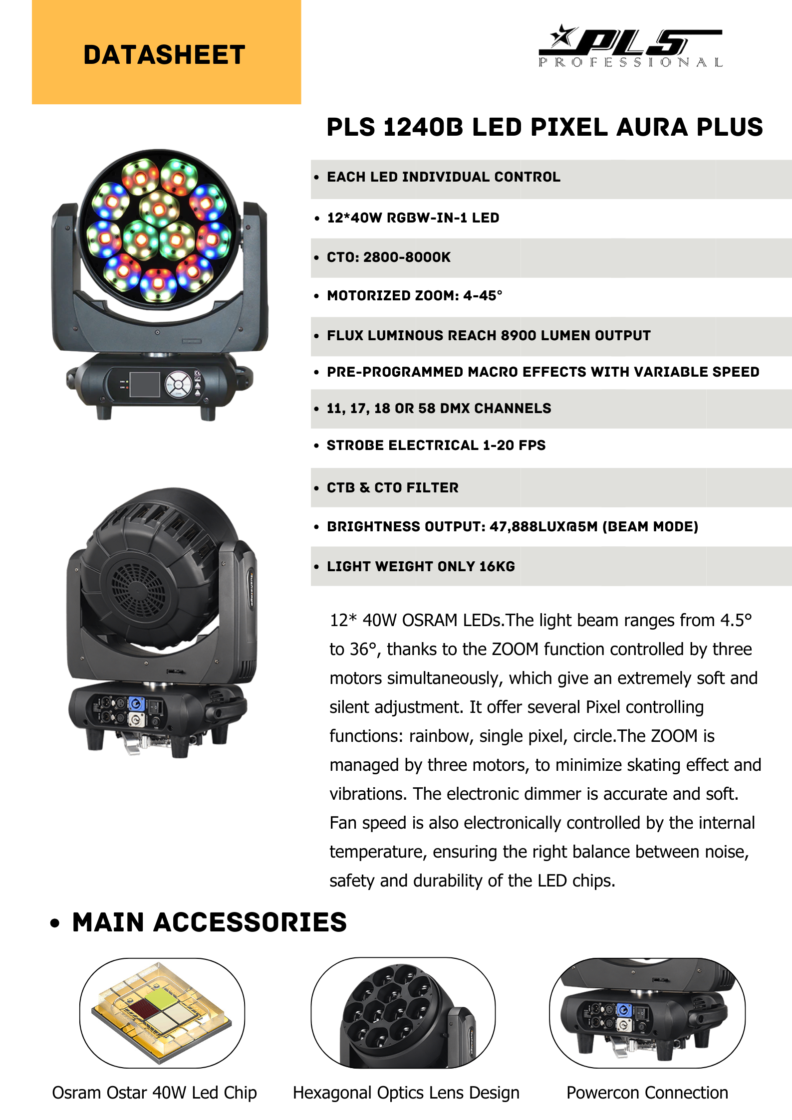 12* 40W OSRAM LEDs.The light beam ranges from 4.5° to 45°, thanks to the ZOOM function controlled by three motors simultaneously, which give an extremely soft and silent adjustment. It offer several Pixel controlling functions: rainbow, single pixel, circle.The ZOOM is managed by three motors, to minimize skating effect and vibrations. The electronic dimmer is accurate and soft. Fan speed is also electronically controlled by the internal temperature, ensuring the right balance between noise, safety and durability of the LED chips.