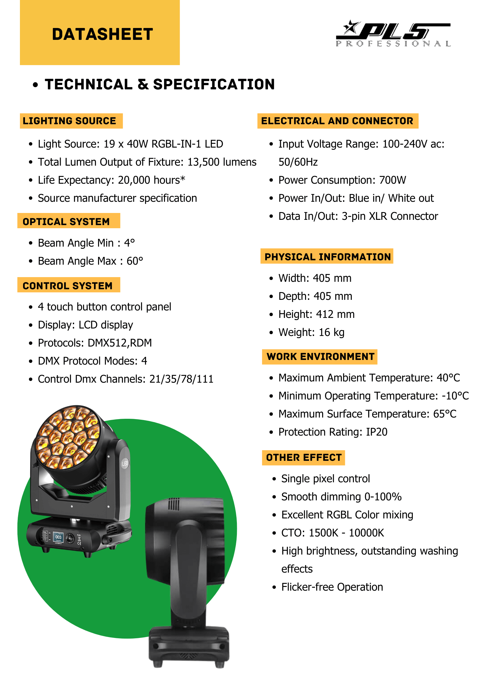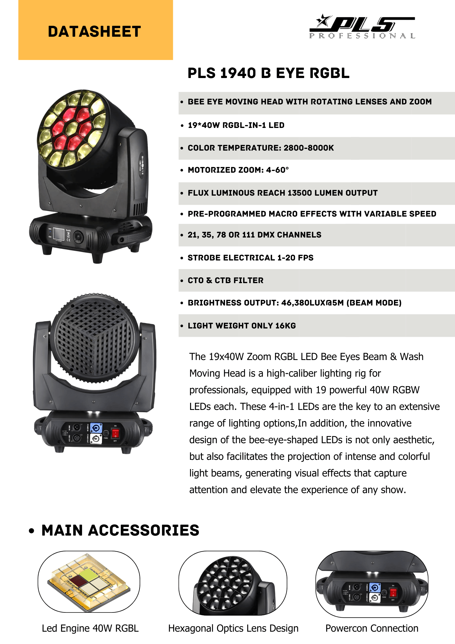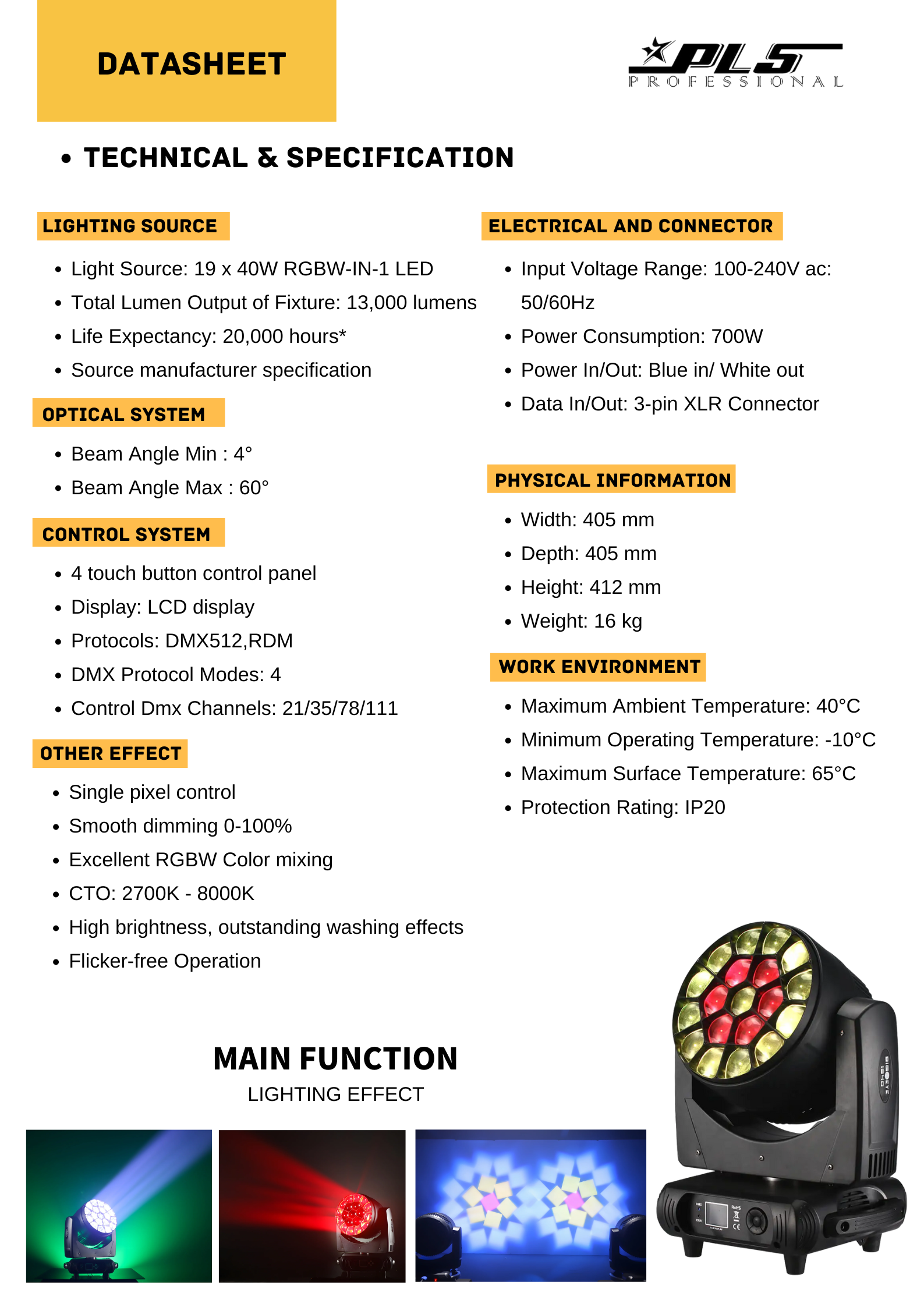 The 19x40W Zoom RGBW LED Bee Eyes Beam & Wash Moving Head is a high-caliber lighting rig for professionals, equipped with 19 powerful 40W RGBW LEDs each. These 4-in-1 LEDs are the key to an extensive range of lighting options,In addition, the innovative design of the bee-eye-shaped LEDs is not only aesthetic, but also facilitates the projection of intense and colorful light beams, generating visual effects that capture attention and elevate the experience of any show.