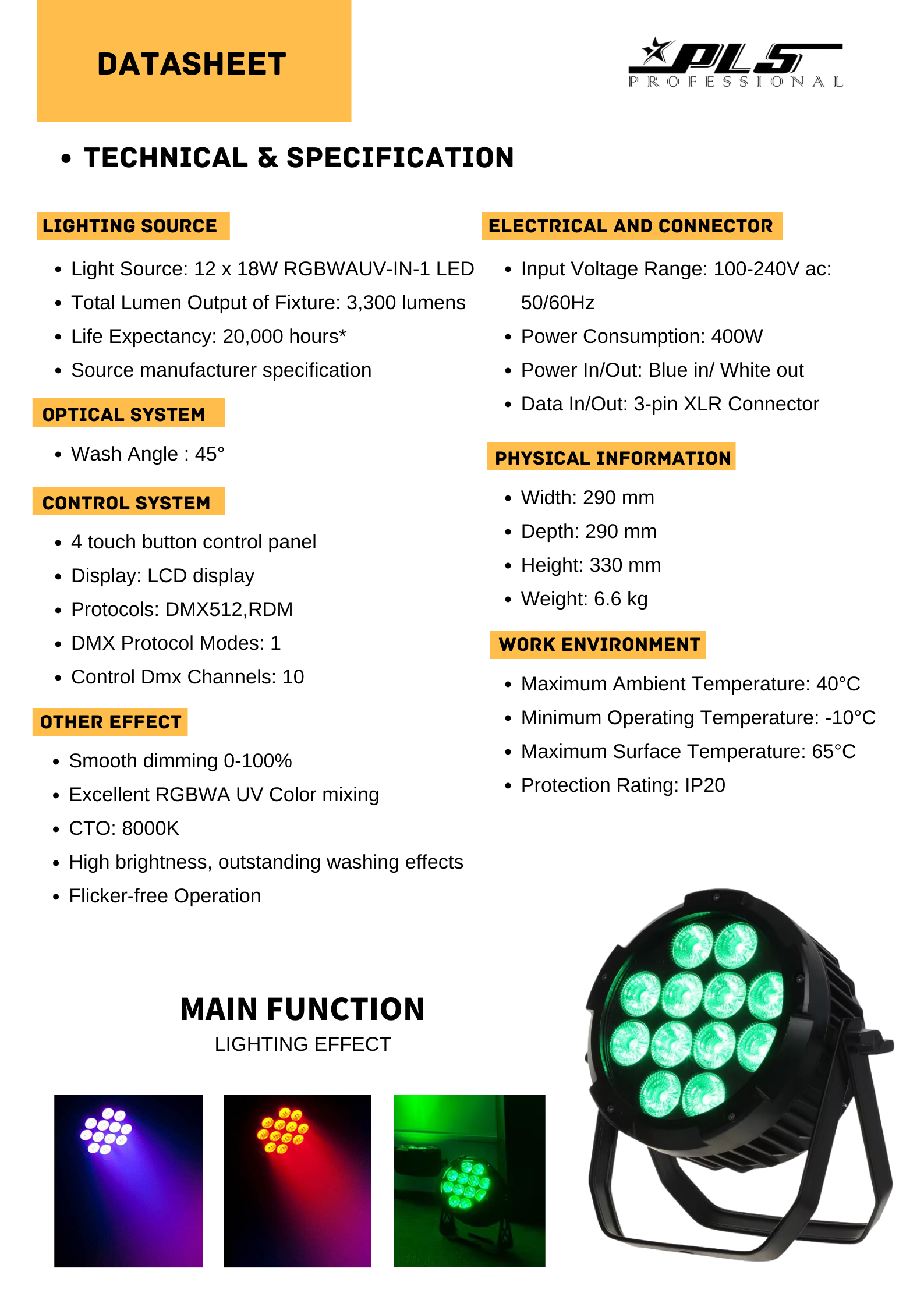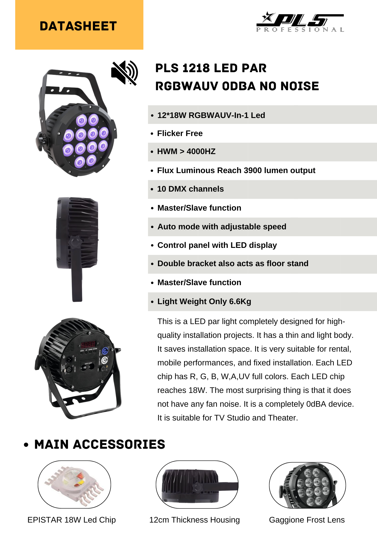 This is a LED par light completely designed for high-quality installation projects. It has a thin and light body. It saves installation space. It is very suitable for rental, mobile performances, and fixed installation. Each LED chip has R, G, B, W,A,UV full colors. Each LED chip reaches 18W. The most surprising thing is that it does not have any fan noise. It is a completely 0dBA device. It is suitable for TV Studio and Theater.