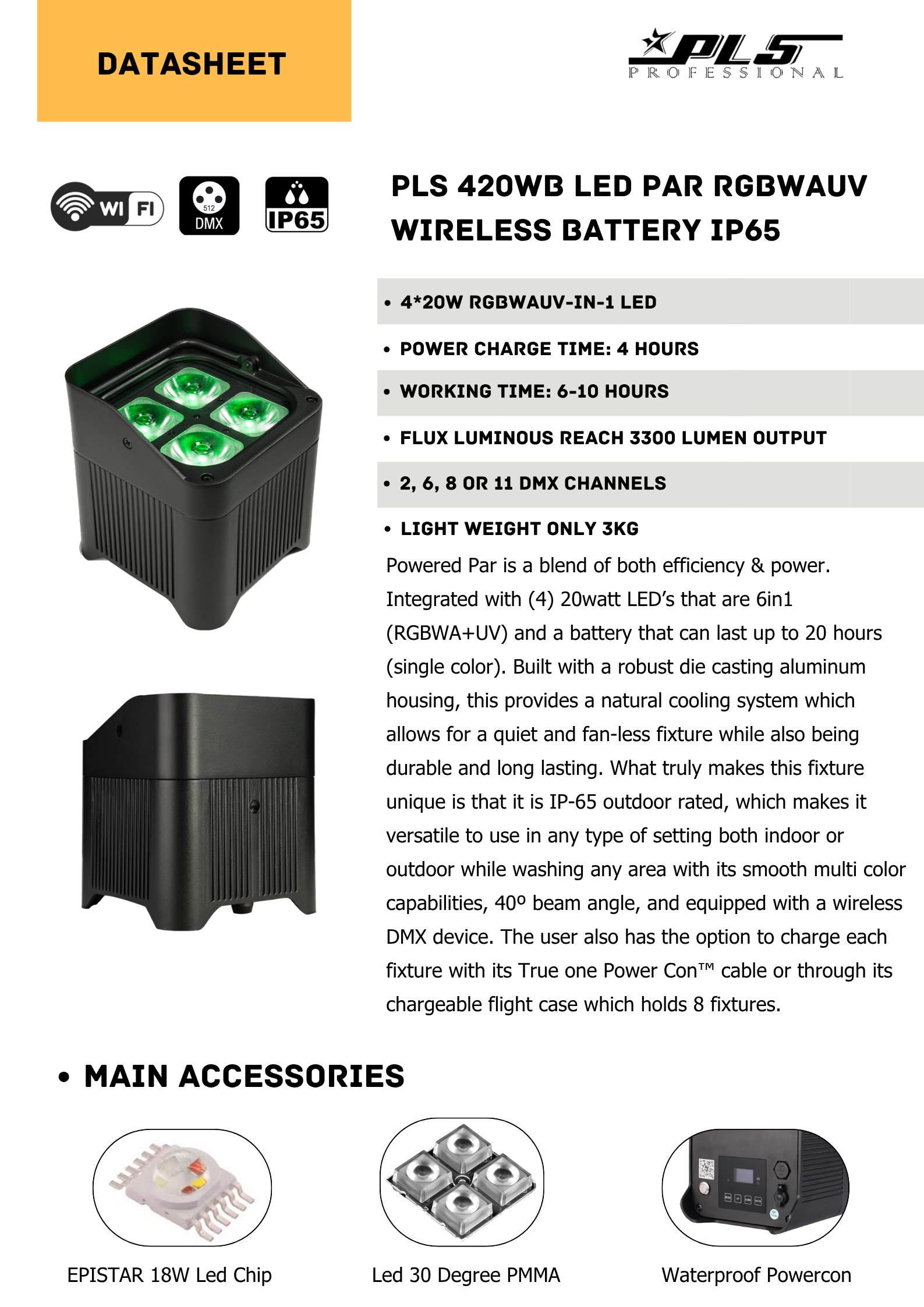 Powered Par is a blend of both efficiency & power. Integrated with (4) 20watt LED’s that are 6in1 (RGBWA+UV) and a battery that can last up to 20 hours (single color). Built with a robust die casting aluminum housing, this provides a natural cooling system which allows for a quiet and fan-less fixture while also being durable and long lasting. What truly makes this fixture unique is that it is IP-65 outdoor rated, which makes it versatile to use in any type of setting both indoor or outdoor while washing any area with its smooth multi color capabilities, 40º beam angle, and equipped with a wireless DMX device. The user also has the option to charge each fixture with its True one Power Con™ cable or through its chargeable flight case which holds 8 fixtures.