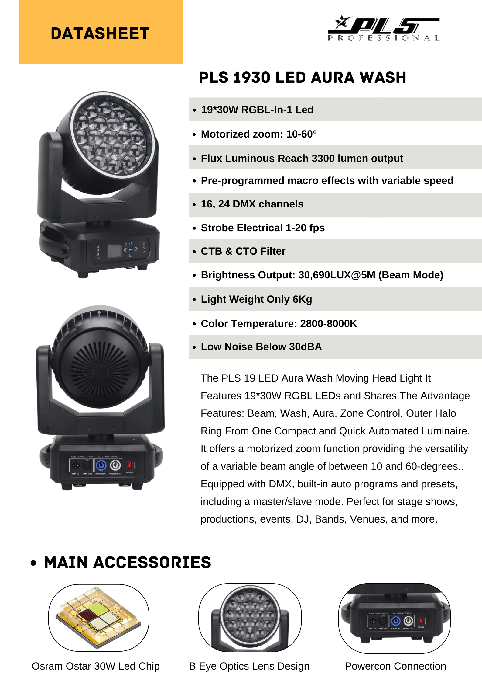 The PLS 19 LED Aura Wash Moving Head Light It Features 19*30W RGBL LEDs and Shares The Advantage Features: Beam, Wash, Aura, Zone Control, Outer Halo Ring From One Compact and Quick Automated Luminaire. It offers a motorized zoom function providing the versatility of a variable beam angle of between 10 and 60-degrees.. Equipped with DMX, built-in auto programs and presets, including a master/slave mode. Perfect for stage shows, productions, events, DJ, Bands, Venues, and more.