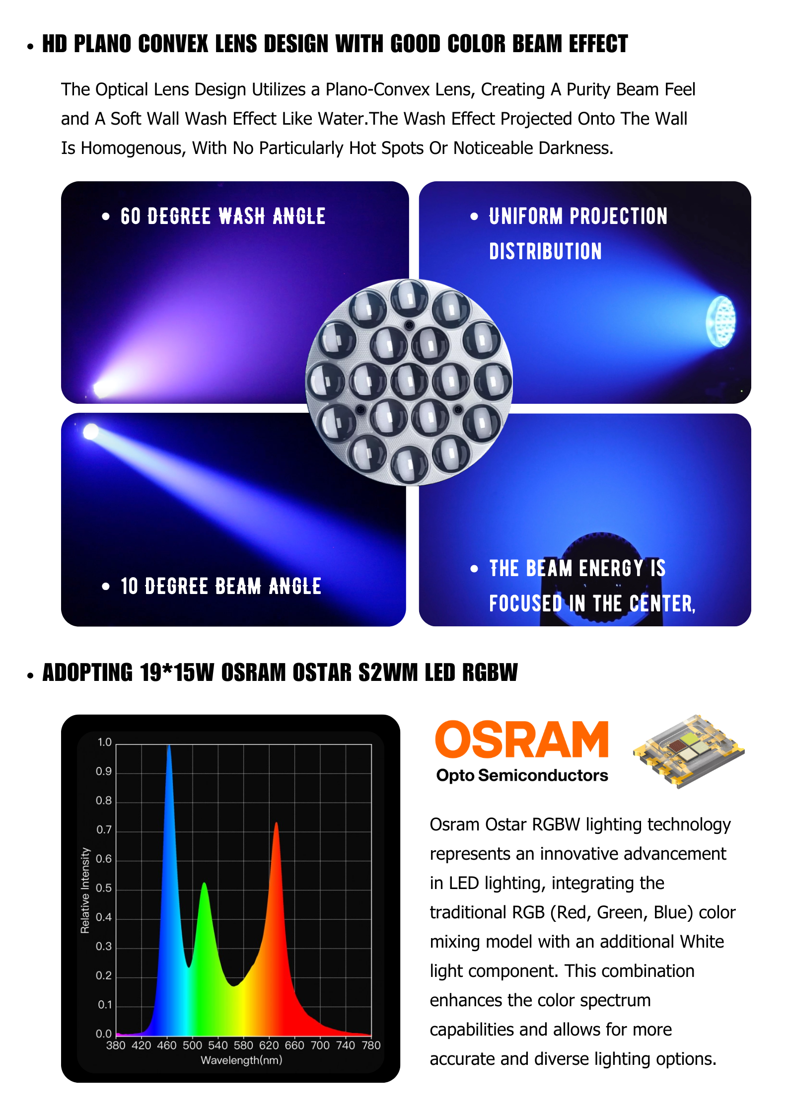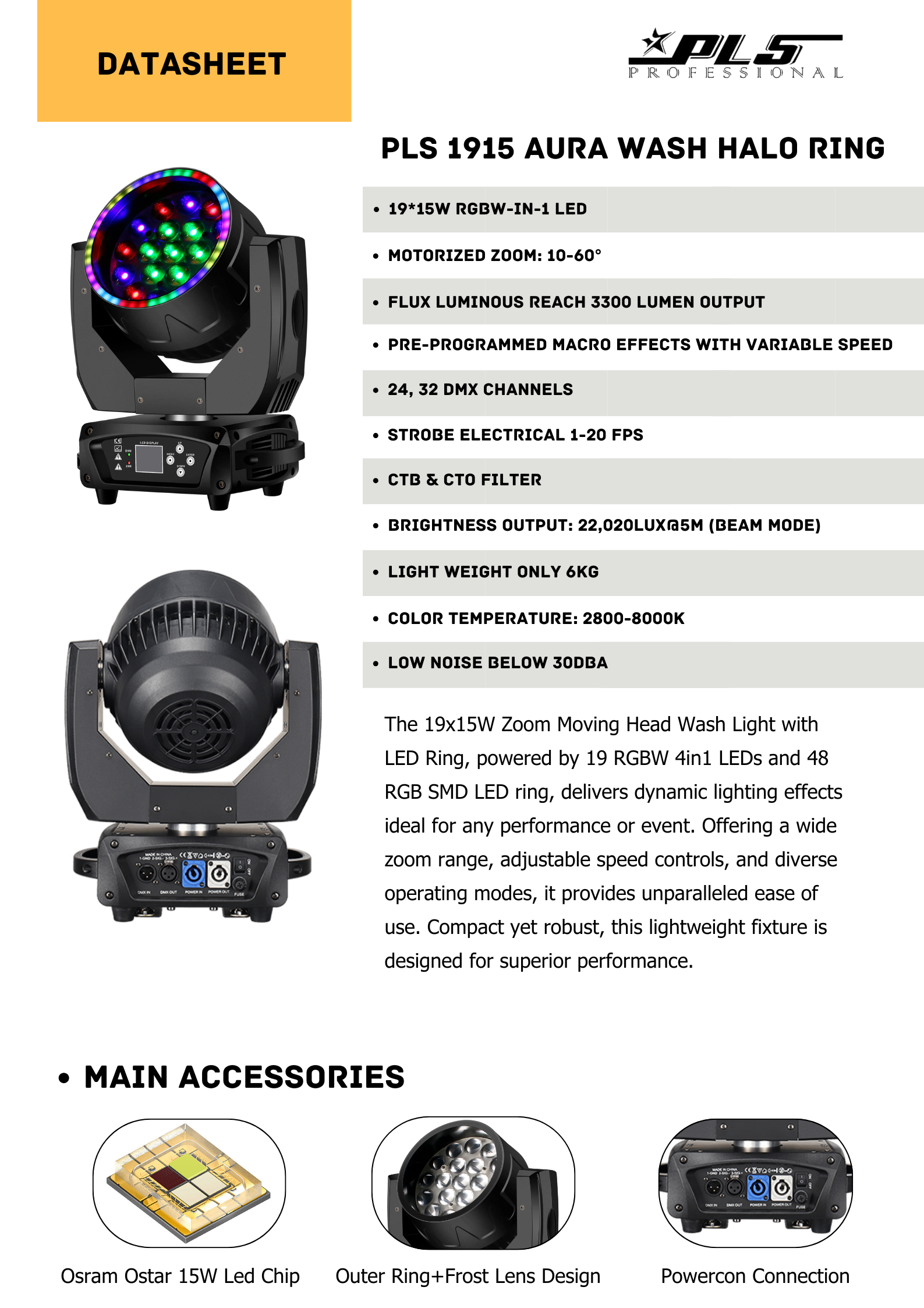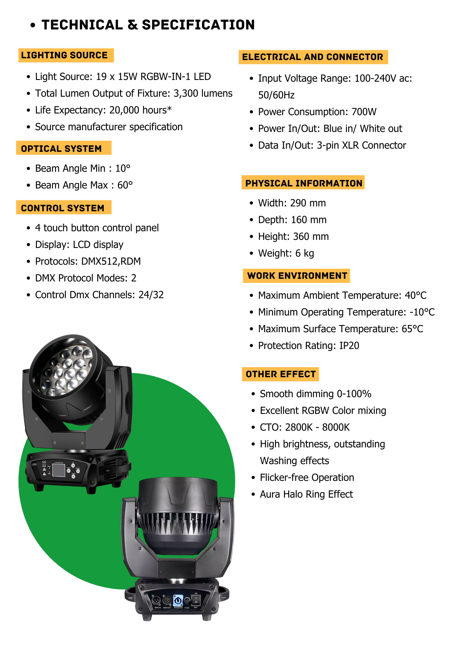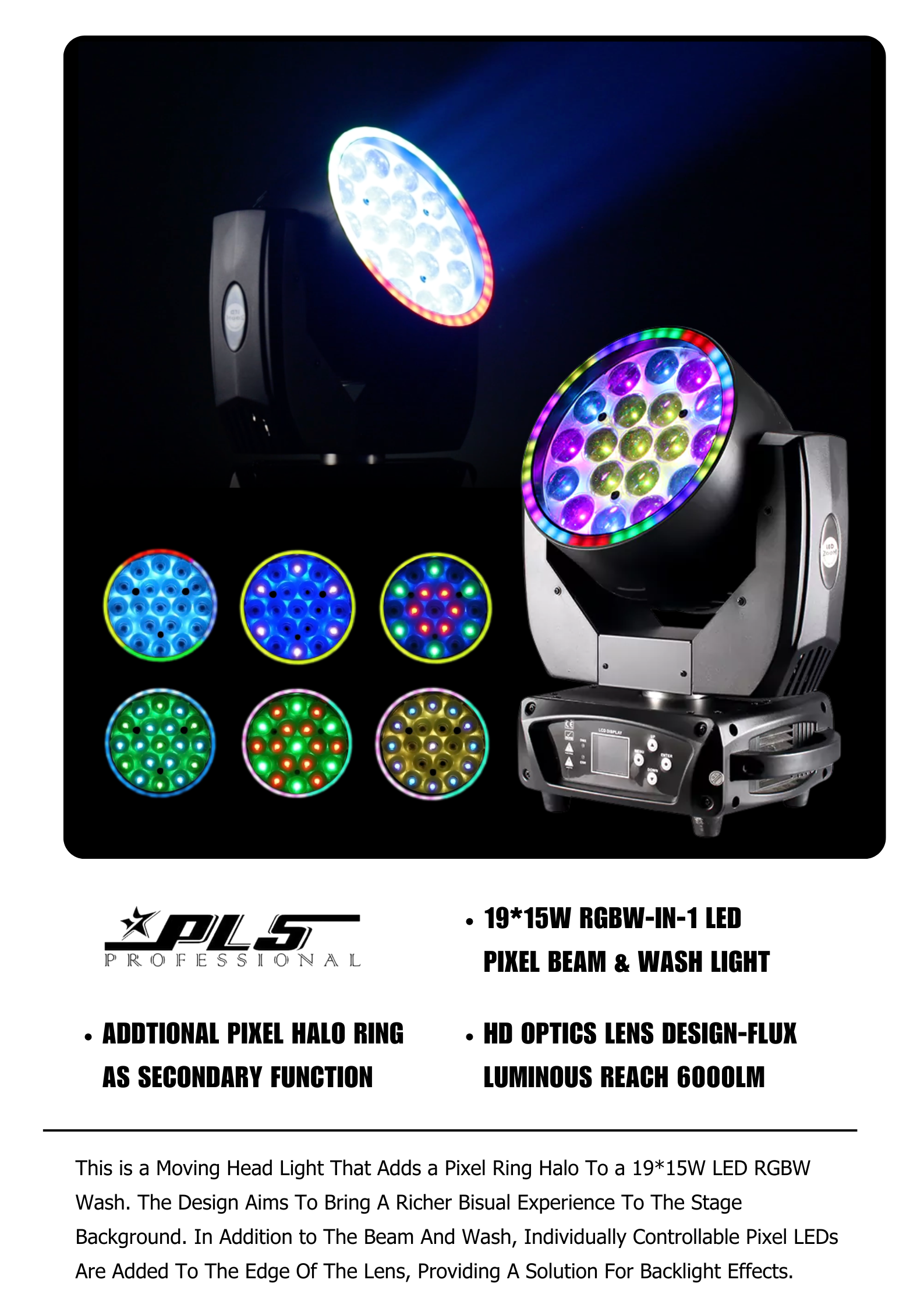 The 19x15W Zoom Moving Head Wash Light with LED Ring, powered by 19 RGBW 4in1 LEDs and 48 RGB SMD LED ring, delivers dynamic lighting effects ideal for any performance or event. Offering a wide zoom range, adjustable speed controls, and diverse operating modes, it provides unparalleled ease of use. Compact yet robust, this lightweight fixture is designed for superior performance.