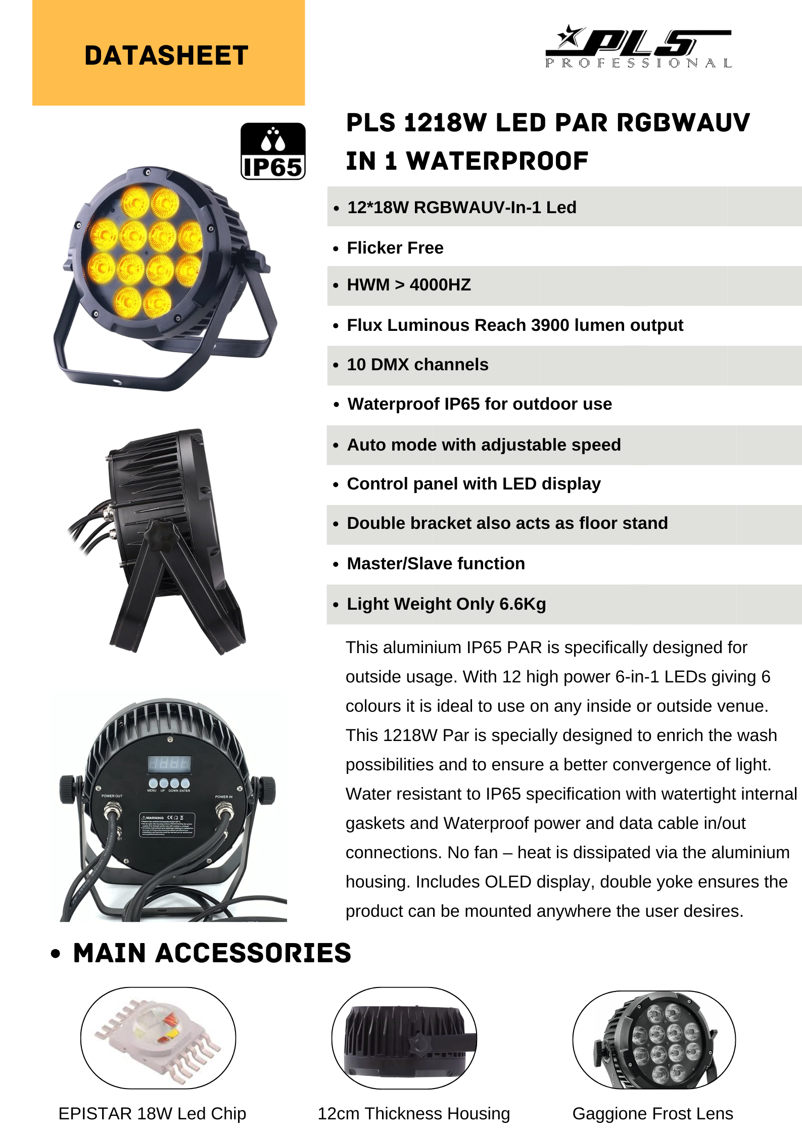 An IP65-rated RGBAW+UV LED wash light that delivers soft fields of saturated colors in any weather condition, well suited for touring companies, rental houses, festivals, clubs, bars, cruise ships, and houses of worship.The fixture features a user-friendly OLED full-text display with password protection and touchscreen interface. The IP65-rated connection for power and DMX allows for use during inclement weather and outdoor settings. The attached double-bracketed yoke can be used as a floor stand. A gel-frame holder, Omega bracket, and Seetronic PowerCON power cable are included.