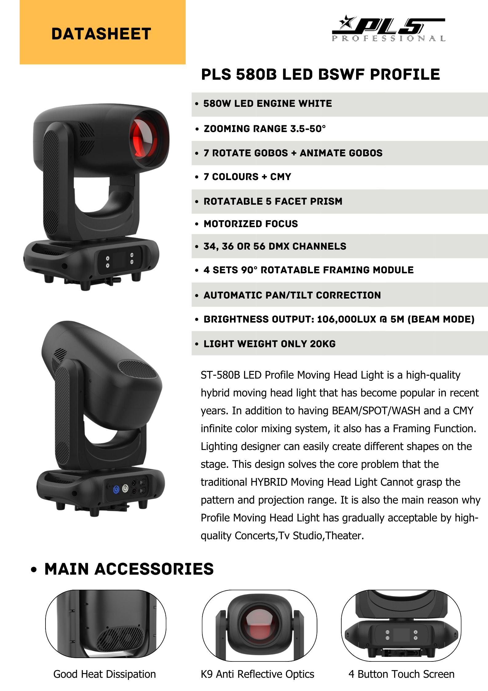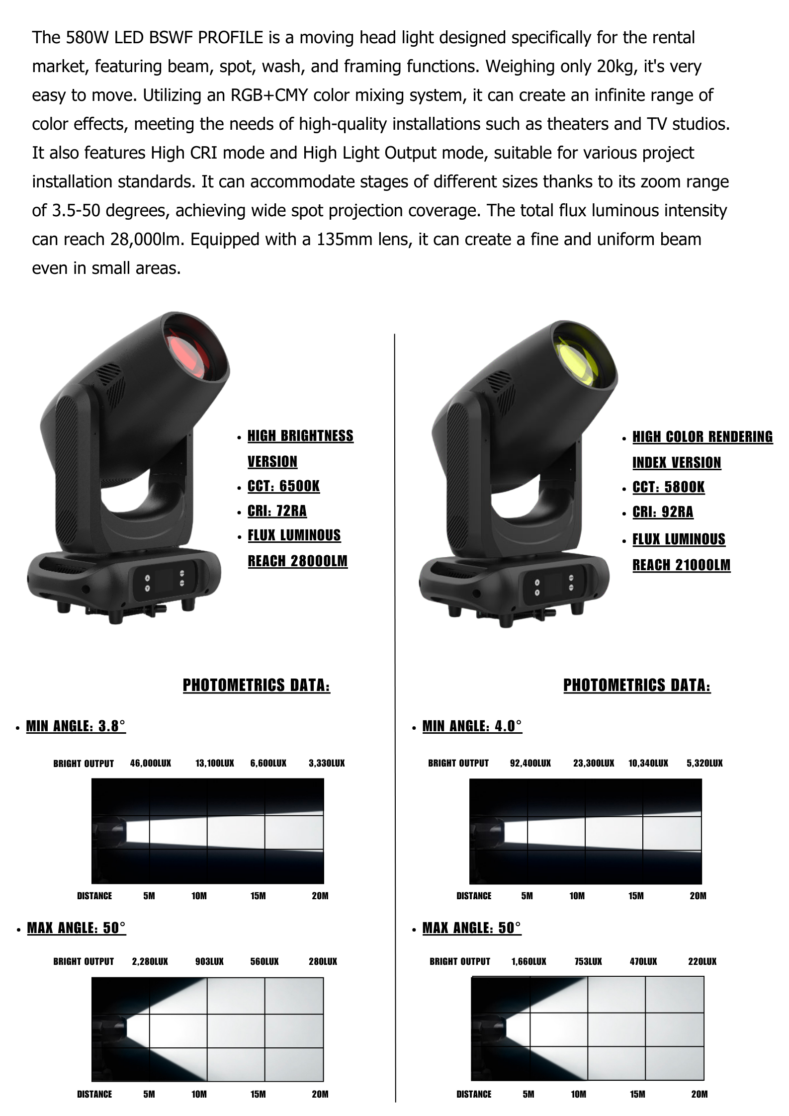 The 580W LED BSWF PROFILE is a moving head light designed specifically for the rental market, featuring beam, spot, wash, and framing functions. Weighing only 20kg, it's very easy to move. Utilizing an RGB+CMY color mixing system, it can create an infinite range of color effects, meeting the needs of high-quality installations such as Theater and TV studios. It also features High CRI mode and High Light Output mode, suitable for various project installation standards. It can accommodate stages of different sizes thanks to its zoom range of 3.5-50 degrees, achieving wide spot projection coverage. The total flux luminous intensity can reach 28,000lm. Equipped with a 135mm lens, it can create a fine and uniform beam even in small areas.