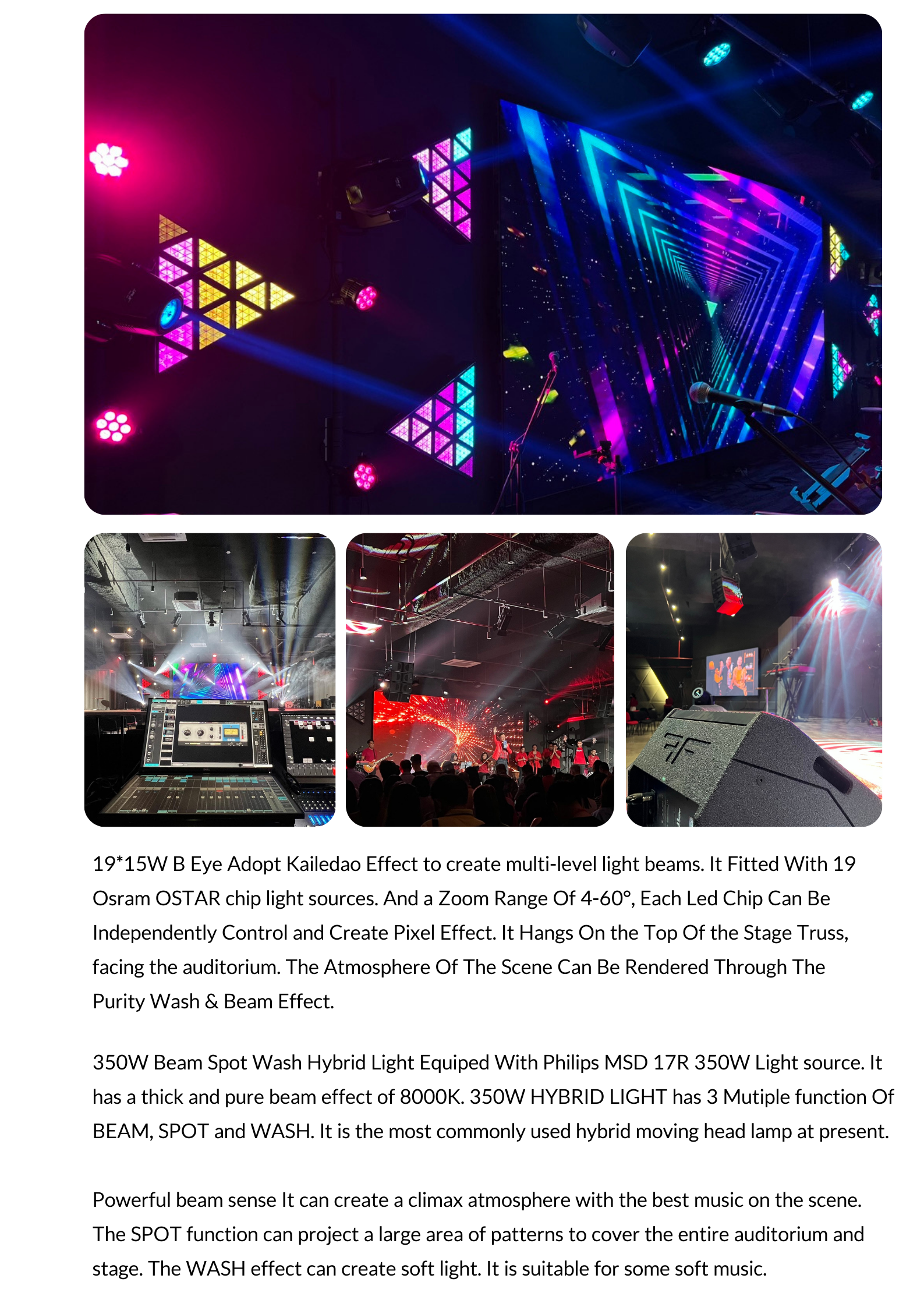 This type of light can flash at high speed, producing an effect similar to a "flash". By controlling the frequency of the flash and the intensity of the flash, the moving head strobe light can achieve a variety of flashing and explosive light effects to enhance the atmosphere of the stage.Moving head strobe lights are usually equipped with high-power LED bulbs, which can provide strong brightness and adapt to the lighting needs of large areas. At the same time, they often support color changes, equipped with multiple color filters or adjustable RGB functions, and can adjust the light color to match the atmosphere in different performances.