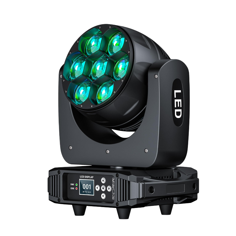 The Zoom moving head 7*40W is one of high-power led wash moving head light series. Also using Osram 40W RGBW 4in1 Led chips, this product has excellent performance in brightness. Compared to the Zoom moving head 12*40W, it is smaller in size, and it is widely used not only in large stage, but also small discos, events and clubs. The 4.5-45° smooth zoom function allows controlling the wash range freely. 0-100% linear electronic dimmer makes the color transition from light to dark naturally. In order to have better heat dissipation, we have improved the fan, which can adjust the speed according to the temperature, although it can operate normally even after working for a long time. Pixel led control makes color changes endless.