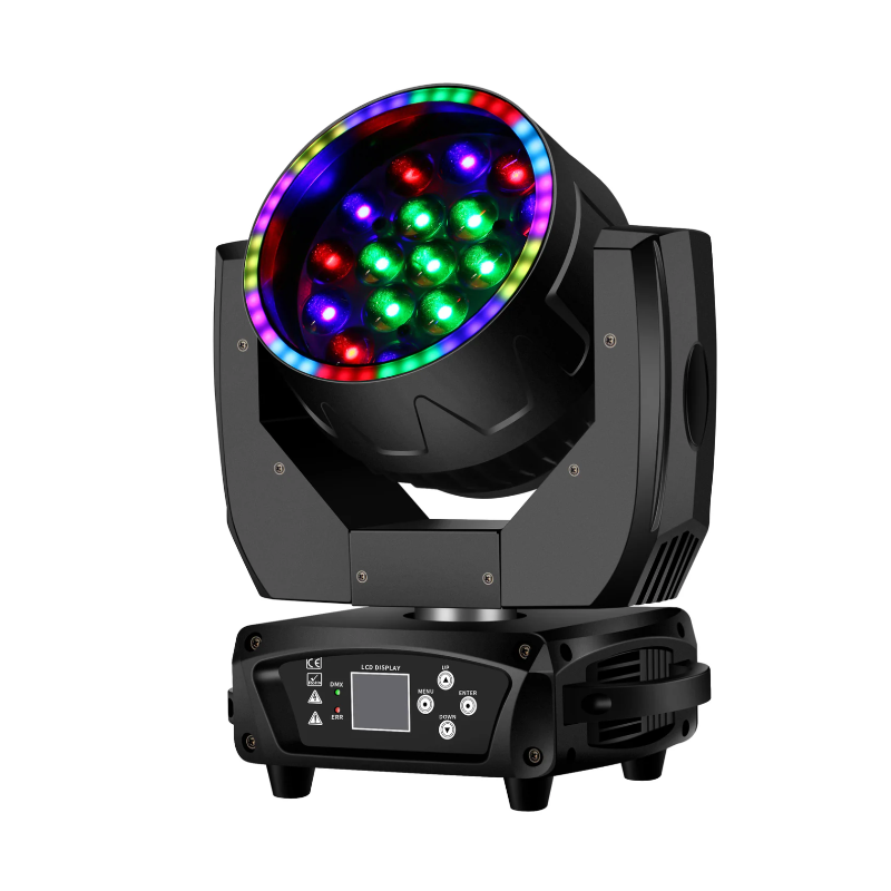 The 19x15W Zoom Moving Head Wash Light with LED Ring, powered by 19 RGBW 4in1 LEDs and 48 RGB SMD LED ring, delivers dynamic lighting effects ideal for any performance or event. Offering a wide zoom range, adjustable speed controls, and diverse operating modes, it provides unparalleled ease of use. Compact yet robust, this lightweight fixture is designed for superior performance.