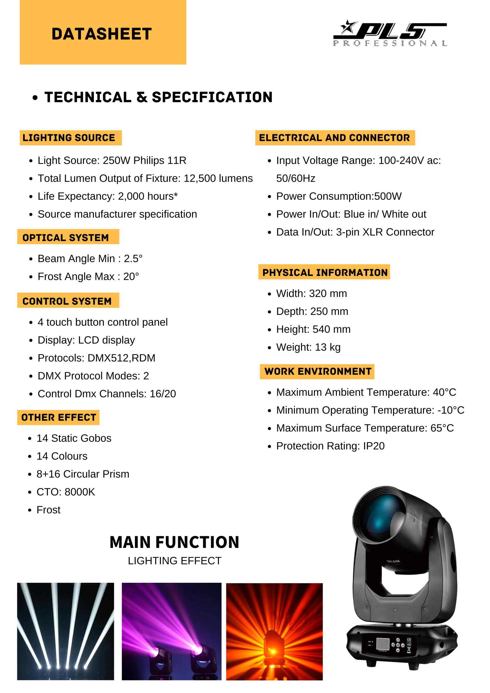 The PLS 250 Rush Beam is a compact moving head that generates impressive light output with its Philips 11R 250W high-intensity discharge lamp. This versatile moving head features a comprehensive range of effects, including colour mixing, a frost effect, various gobos and a prism, giving users precise control over their lighting designs.The PLS 250 Rush Beam includes a gobo wheel equipped with 14 patterns plus an open position and a colour wheel with 14 colours plus an open position, offering endless creative possibilities. Operating seamlessly in DMX or stand-alone mode