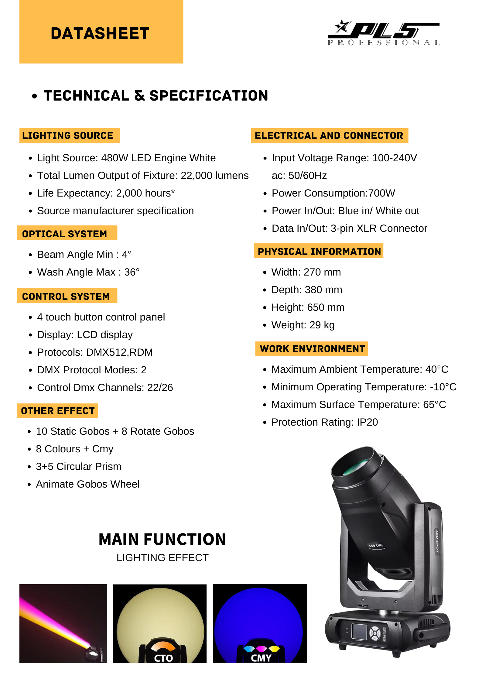 The PLS 480 Cmy Hybrid features a very powerful 480W LED source, enough to light up even the biggest dance floors. Equipped with a dual gobo wheel (1x with interchangeable glass gobos) to create stunning overlay effects, the PLS 480 Cmy Hybrid also features a CMY + CTO colour mixing system. The zoom function and 2 individually rotating prisms (3+5 facets) create stunning effects and patterns on any dance floor or stage. Ideal for productions, events, and installations that require a larger output fixture.