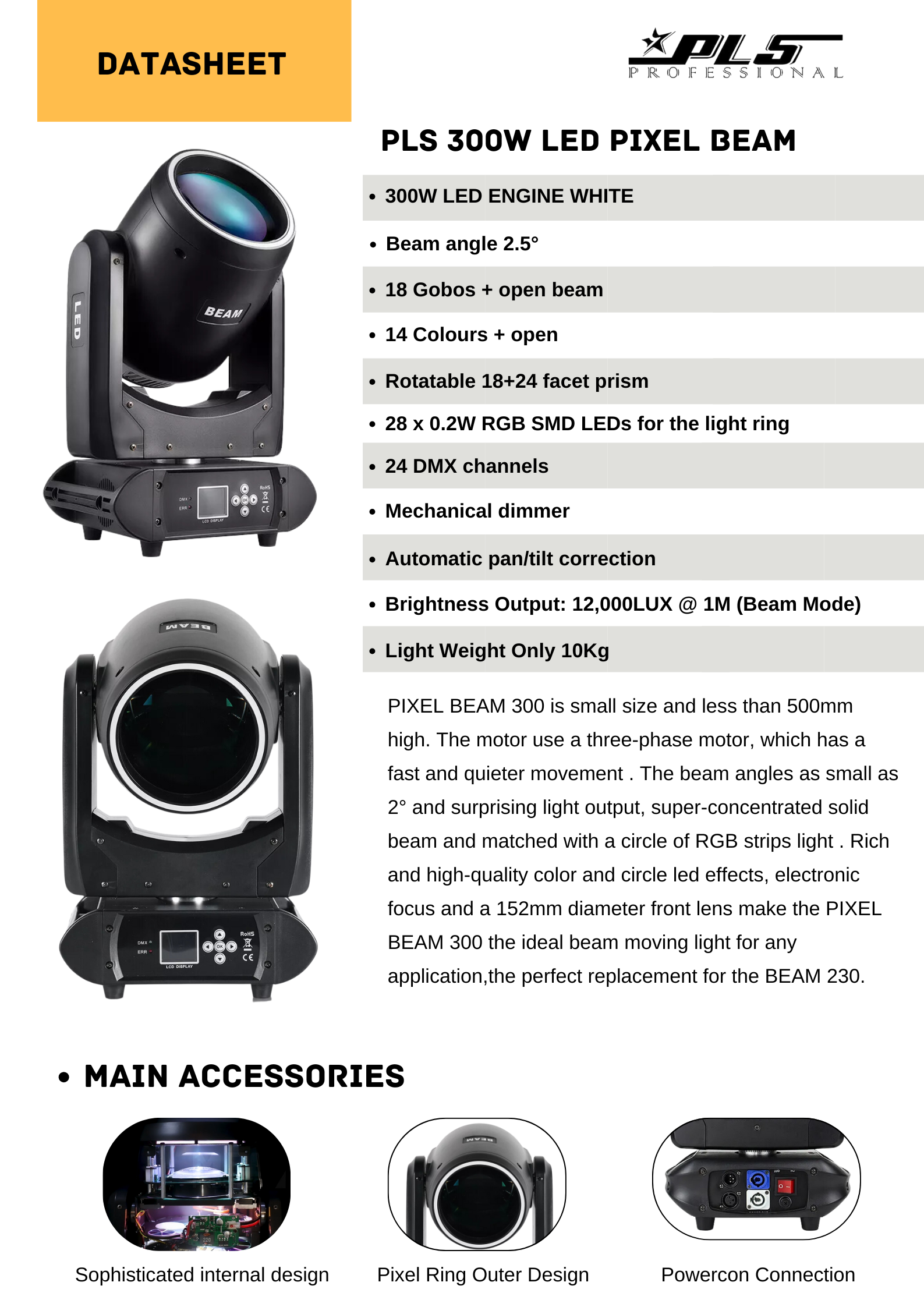 PIXEL BEAM 300 is small size and less than 500mm high. The motor use a three-phase motor, which has a fast and quieter movement . The beam angles as small as 2° and surprising light output, super-concentrated solid beam and matched with a circle of RGB strips light . Rich and high-quality color and circle led effects, electronic focus and a 152mm diameter front lens make the PIXEL BEAM 300 the ideal beam moving light for any application, the perfect replacement for the BEAM 230.