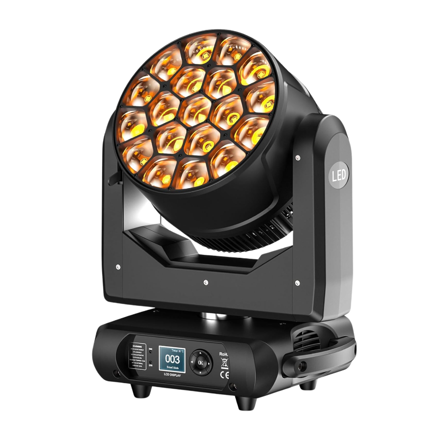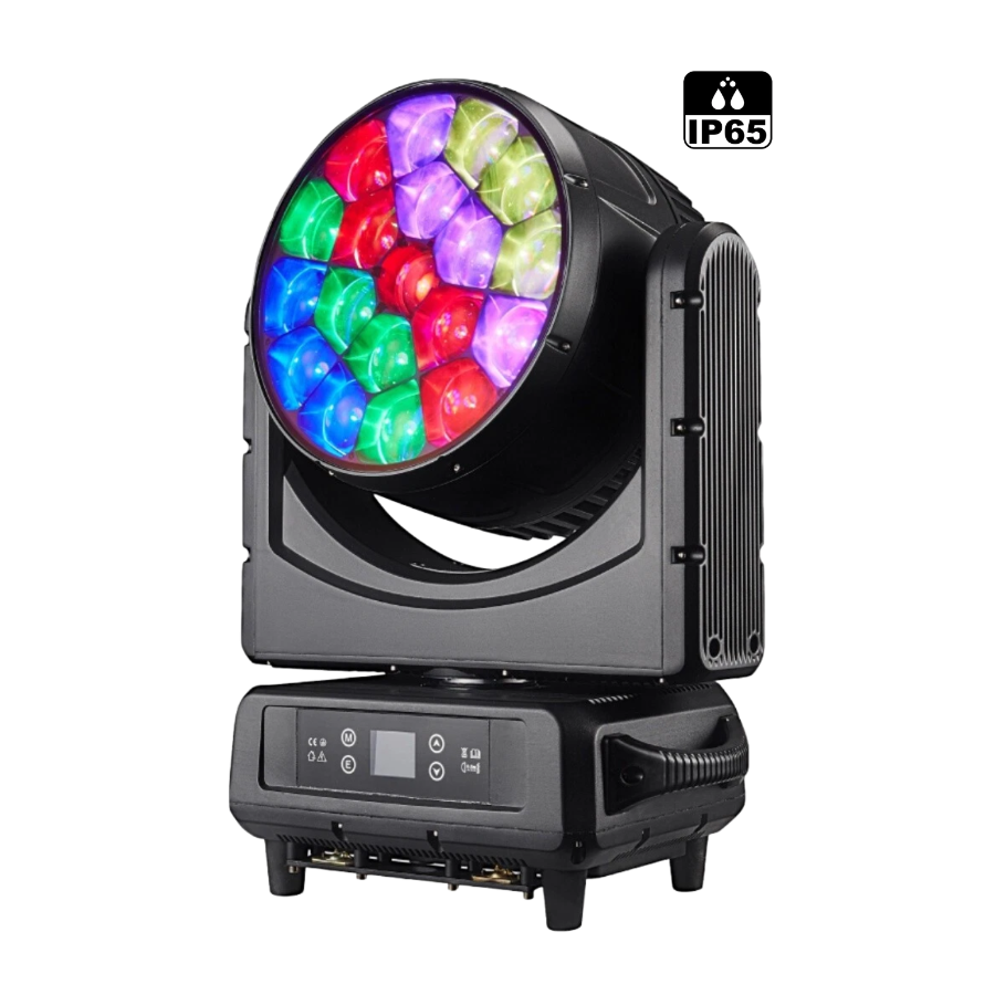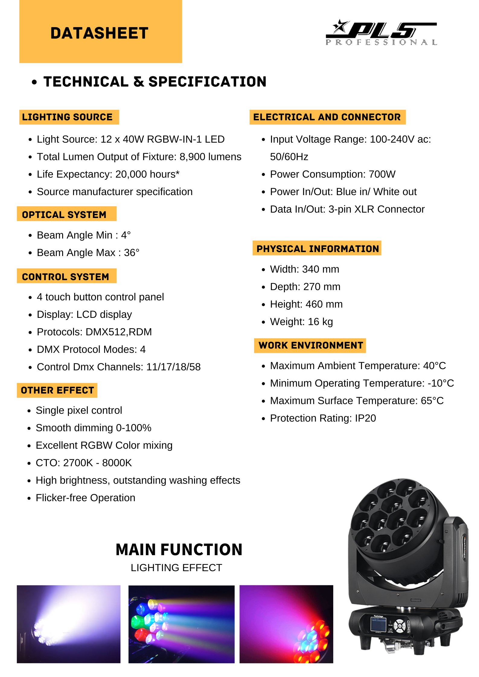 12* 40W OSRAM LEDs.The light beam ranges from 4.5° to 36°, thanks to the ZOOM function controlled by three motors simultaneously, which give an extremely soft and silent adjustment. It offer several Pixel controlling functions: rainbow, single pixel, circle.The ZOOM is managed by three motors, to minimize skating effect and vibrations. The electronic dimmer is accurate and soft. Fan speed is also electronically controlled by the internal temperature, ensuring the right balance between noise, safety and durability of the LED chips.