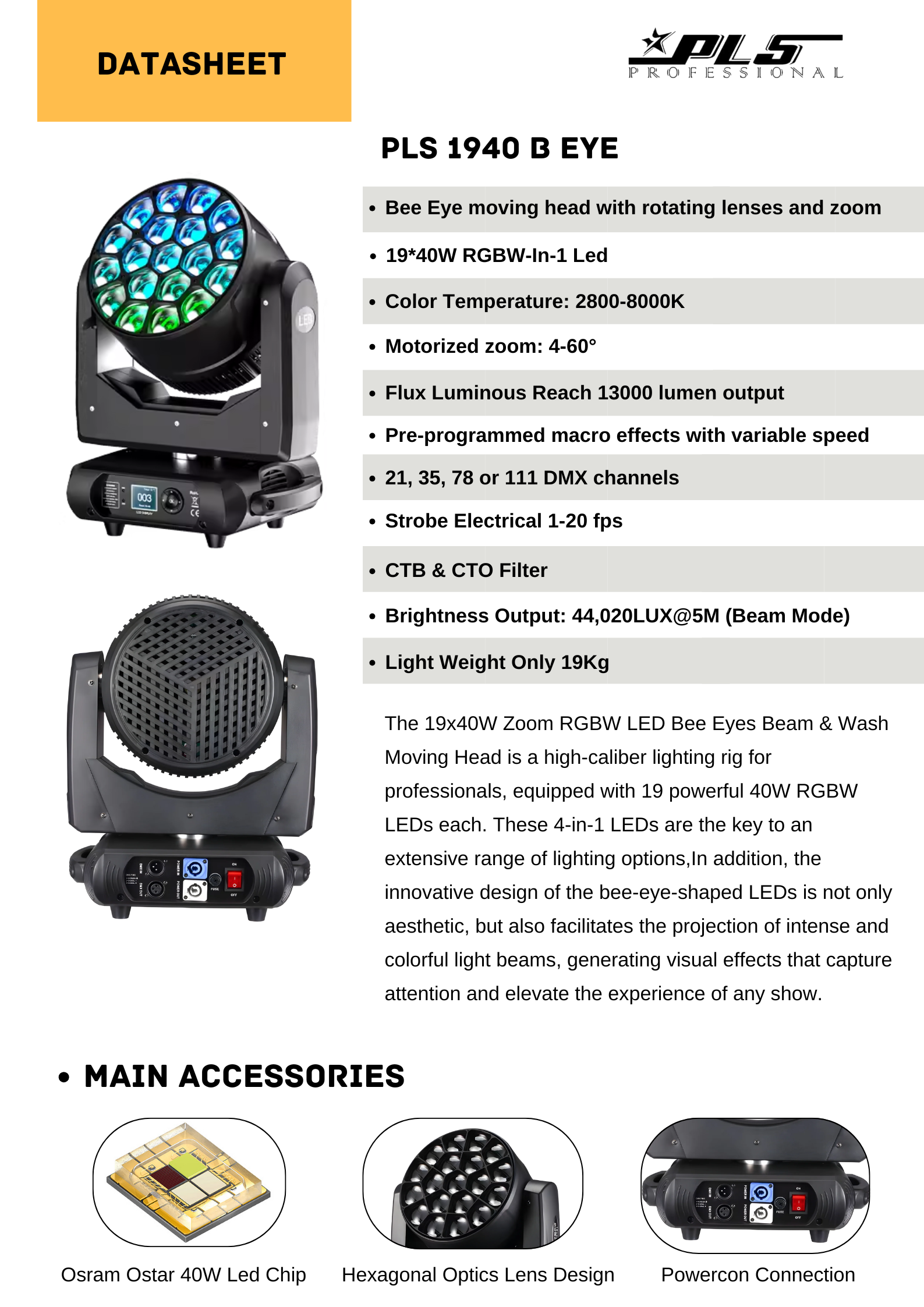 The 19x40W Zoom RGBW LED Bee Eyes Beam & Wash Moving Head is a high-caliber lighting rig for professionals, equipped with 19 powerful 40W RGBW LEDs each. These 4-in-1 LEDs are the key to an extensive range of lighting options,In addition, the innovative design of the bee-eye-shaped LEDs is not only aesthetic, but also facilitates the projection of intense and colorful light beams, generating visual effects that capture attention and elevate the experience of any show.