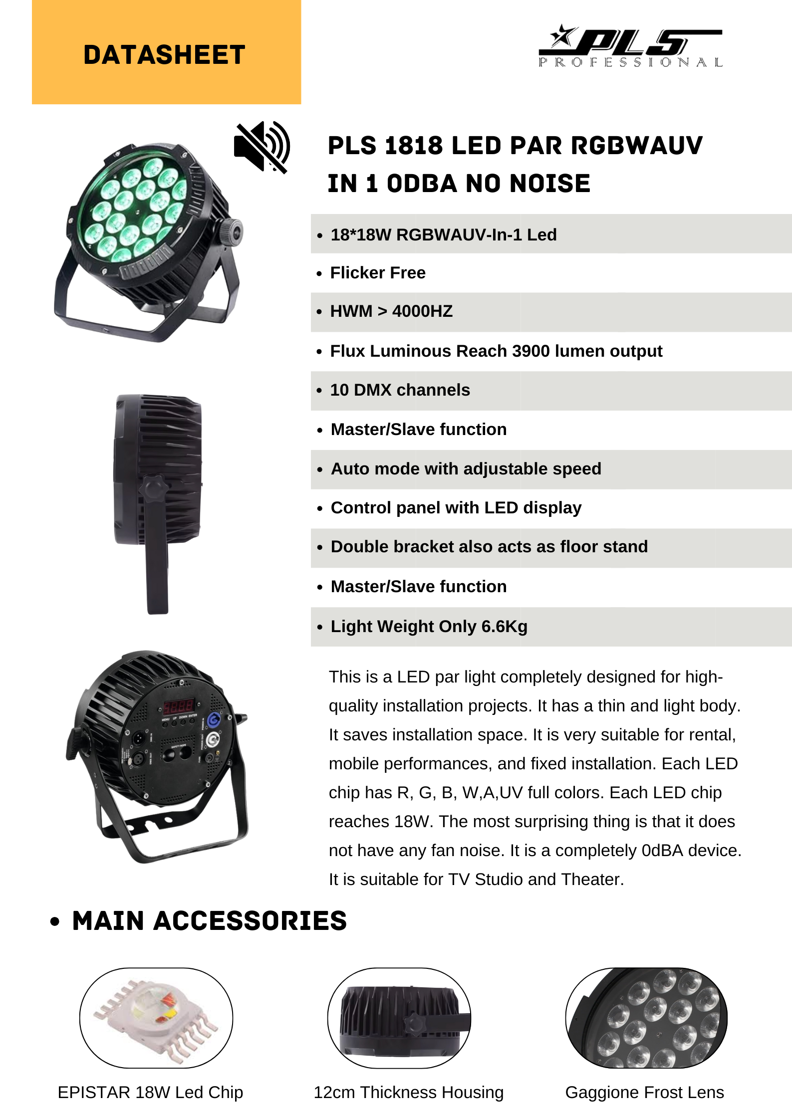 This is a LED par light completely designed for high-quality installation projects. It has a thin and light body. It saves installation space. It is very suitable for rental, mobile performances, and fixed installation. Each LED chip has R, G, B, W,A,UV full colors. Each LED chip reaches 18W. The most surprising thing is that it does not have any fan noise. It is a completely 0dBA device. It is suitable for TV Studio and Theater.