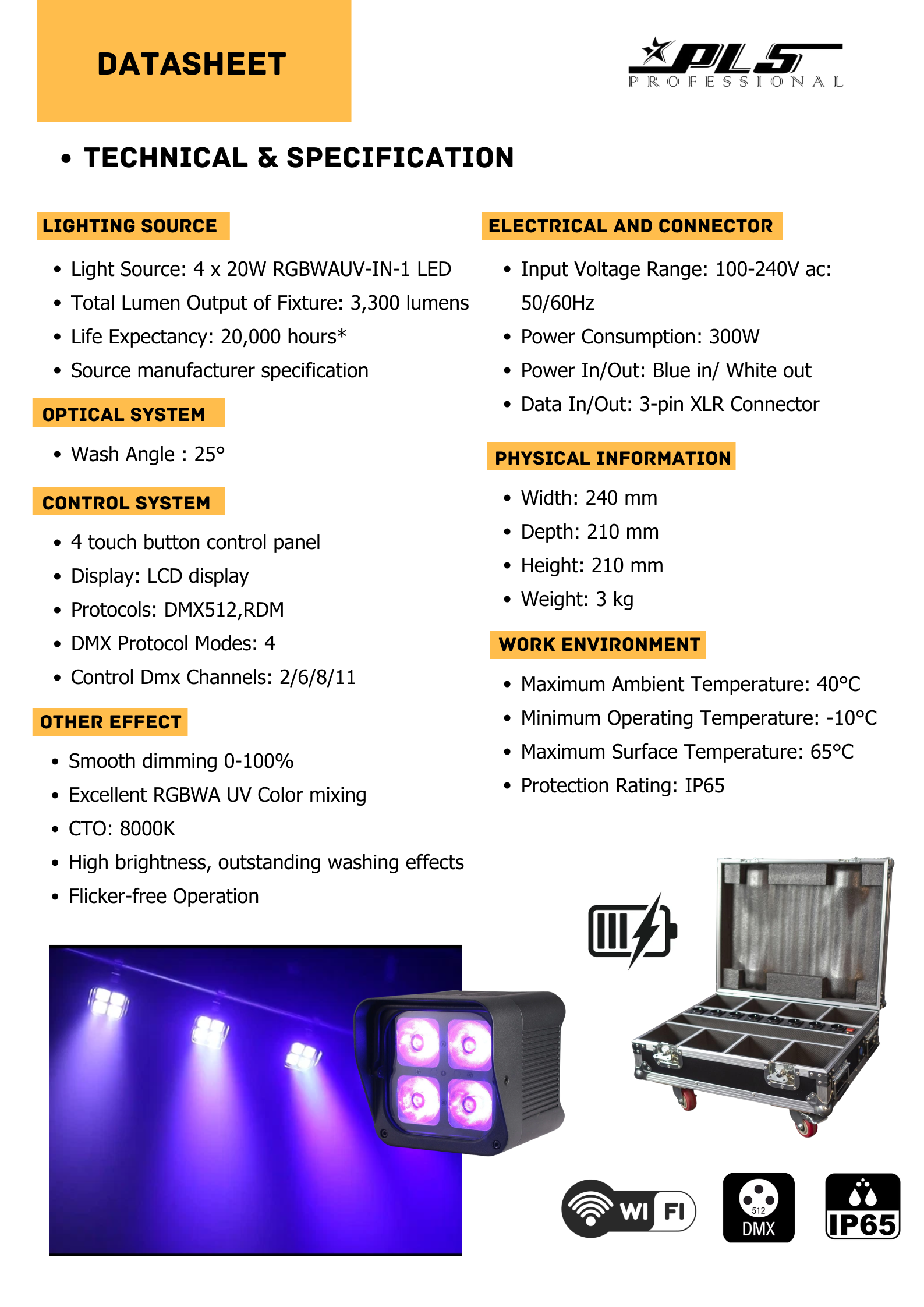 Powered Par is a blend of both efficiency & power. Integrated with (4) 20watt LED’s that are 6in1 (RGBWA+UV) and a battery that can last up to 20 hours (single color). Built with a robust die casting aluminum housing, this provides a natural cooling system which allows for a quiet and fan-less fixture while also being durable and long lasting. What truly makes this fixture unique is that it is IP-65 outdoor rated, which makes it versatile to use in any type of setting both indoor or outdoor while washing any area with its smooth multi color capabilities, 40º beam angle, and equipped with a wireless DMX device. The user also has the option to charge each fixture with its True one Power Con™ cable or through its chargeable flight case which holds 8 fixtures.