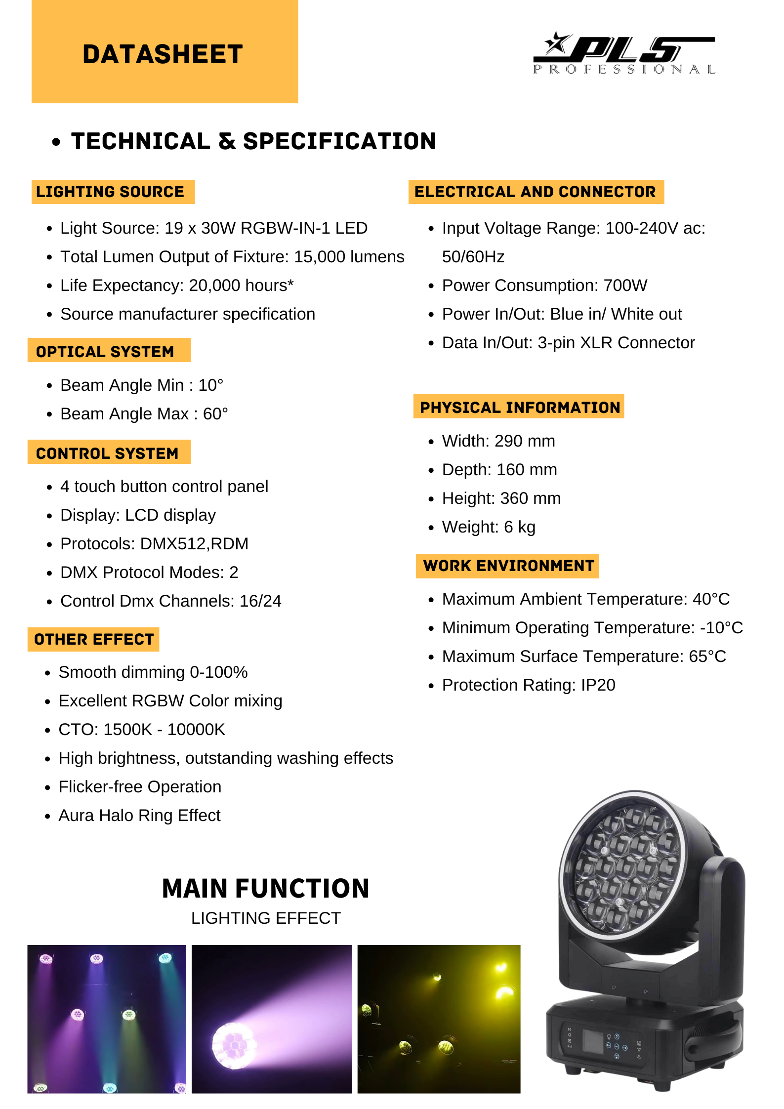 The PLS 19 LED Aura Wash Moving Head Light It Features 19*30W RGBL LEDs and Shares The Advantage Features: Beam, Wash, Aura, Zone Control, Outer Halo Ring From One Compact and Quick Automated Luminaire. It offers a motorized zoom function providing the versatility of a variable beam angle of between 10 and 60-degrees.. Equipped with DMX, built-in auto programs and presets, including a master/slave mode. Perfect for stage shows, productions, events, DJ, Bands, Venues, and more.