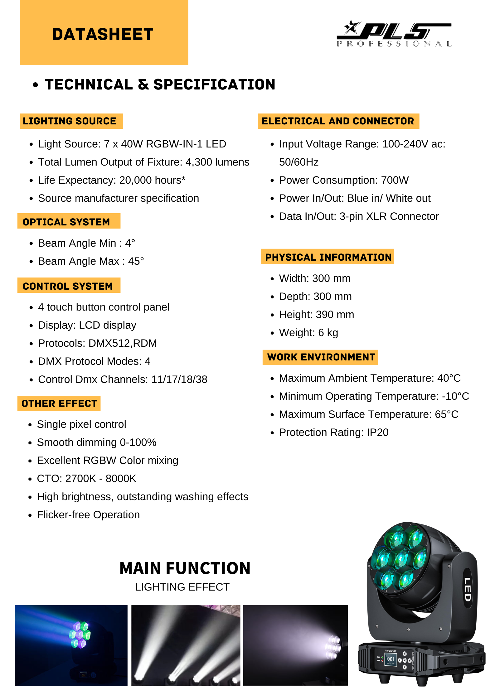 The Zoom moving head 7*40W is one of high-power led wash moving head light series. Also using Osram 40W RGBW 4in1 Led chips, this product has excellent performance in brightness. Compared to the Zoom moving head 12*40W, it is smaller in size, and it is widely used not only in large stage, but also small discos, events and clubs. The 4.5-45° smooth zoom function allows controlling the wash range freely. 0-100% linear electronic dimmer makes the color transition from light to dark naturally. In order to have better heat dissipation, we have improved the fan, which can adjust the speed according to the temperature, although it can operate normally even after working for a long time. Pixel led control makes color changes endless.
