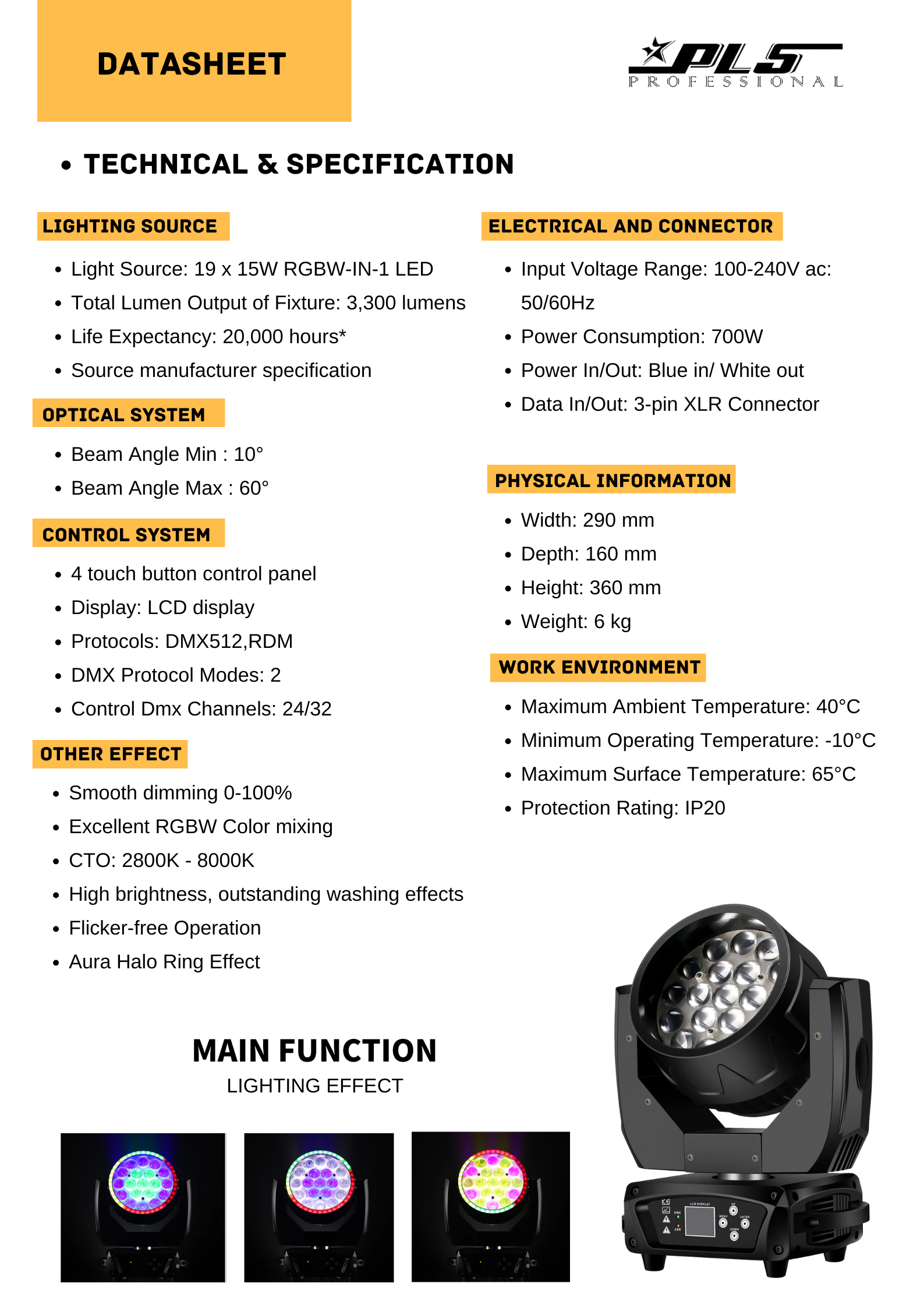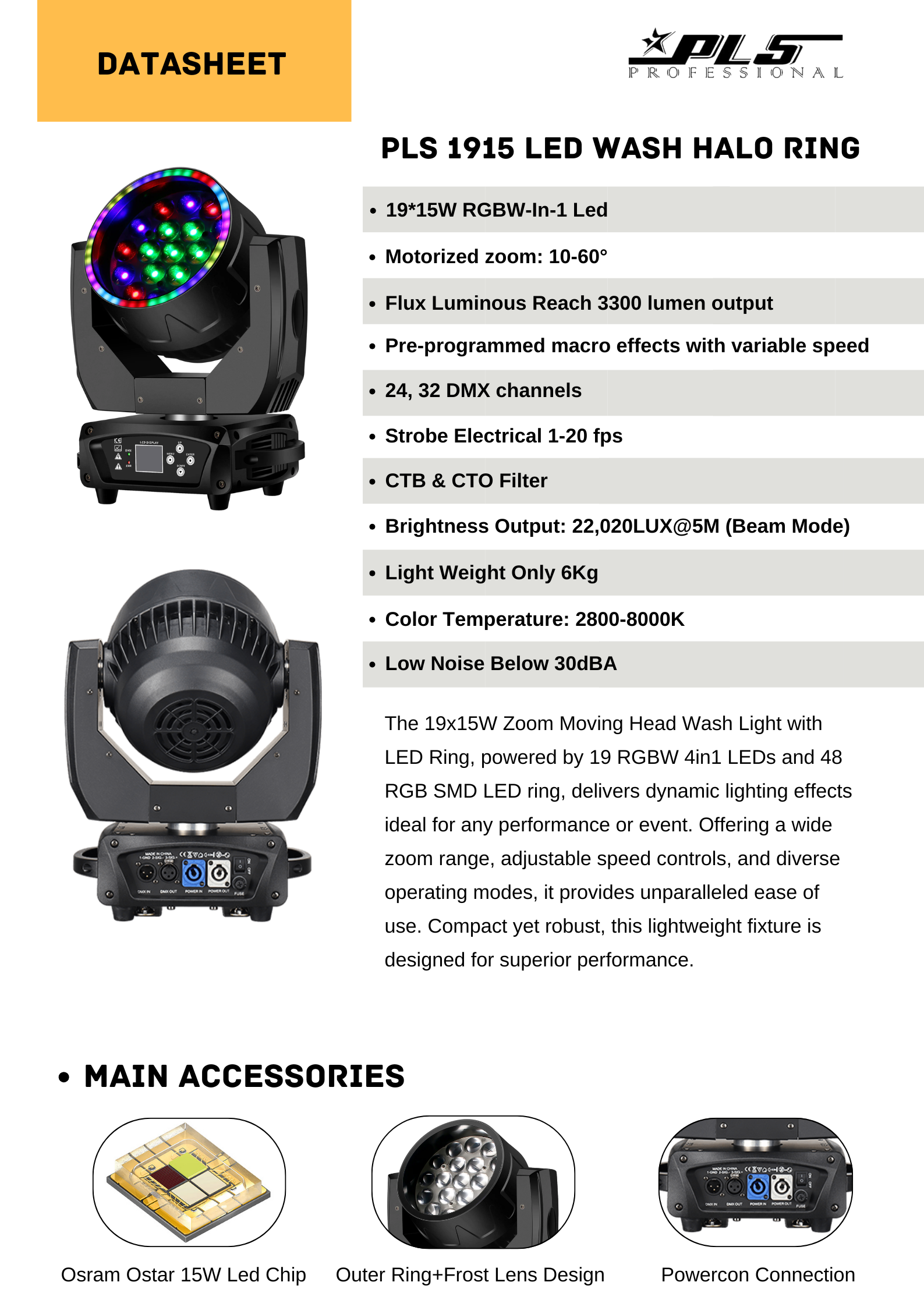 The 19x15W Zoom Moving Head Wash Light with LED Ring, powered by 19 RGBW 4in1 LEDs and 48 RGB SMD LED ring, delivers dynamic lighting effects ideal for any performance or event. Offering a wide zoom range, adjustable speed controls, and diverse operating modes, it provides unparalleled ease of use. Compact yet robust, this lightweight fixture is designed for superior performance.