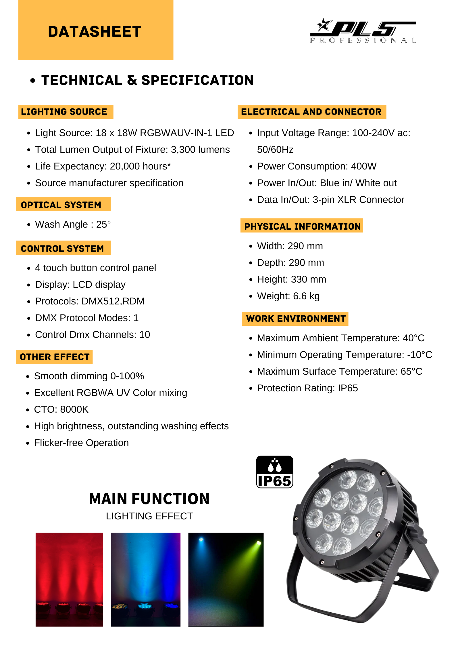An IP65-rated RGBAW+UV LED wash light that delivers soft fields of saturated colors in any weather condition, well suited for touring companies, rental houses, festivals, clubs, bars, cruise ships, and houses of worship.The fixture features a user-friendly OLED full-text display with password protection and touchscreen interface. The IP65-rated connection for power and DMX allows for use during inclement weather and outdoor settings. The attached double-bracketed yoke can be used as a floor stand. A gel-frame holder, Omega bracket, and Seetronic PowerCON power cable are included.