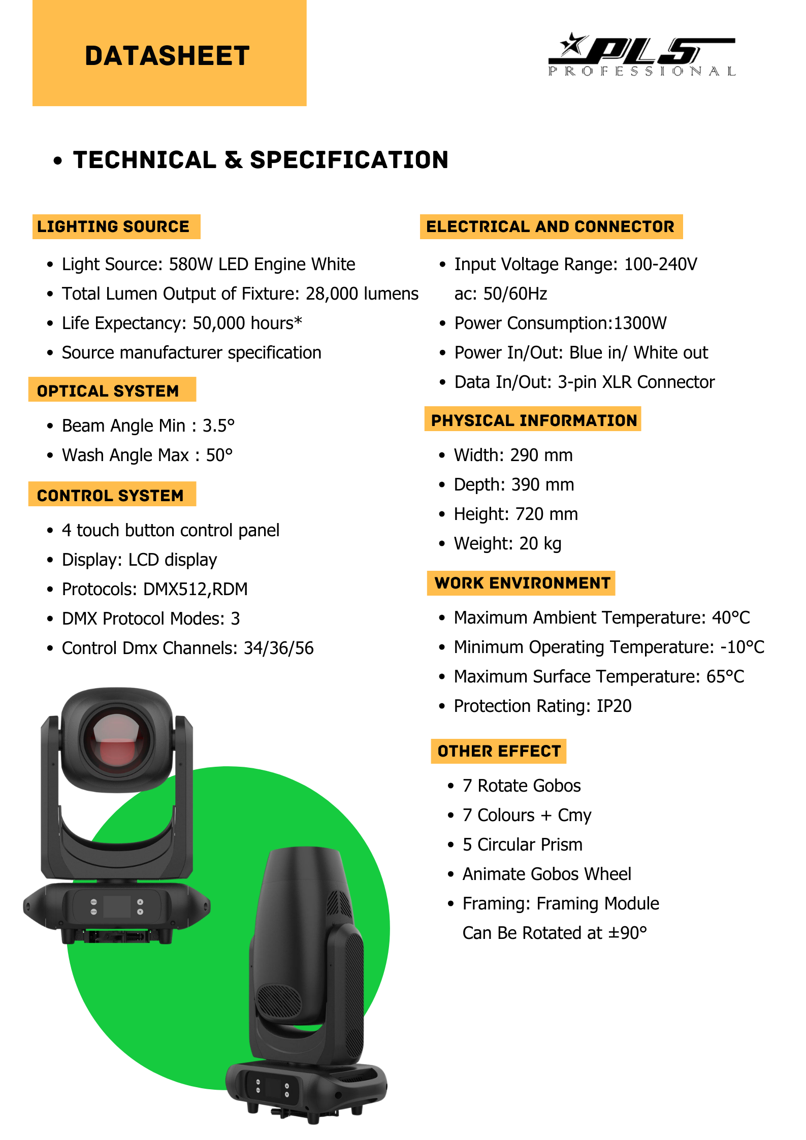 The 580W LED BSWF PROFILE is a moving head light designed specifically for the rental market, featuring beam, spot, wash, and framing functions. Weighing only 20kg, it's very easy to move. Utilizing an RGB+CMY color mixing system, it can create an infinite range of color effects, meeting the needs of high-quality installations such as Theater and TV studios. It also features High CRI mode and High Light Output mode, suitable for various project installation standards. It can accommodate stages of different sizes thanks to its zoom range of 3.5-50 degrees, achieving wide spot projection coverage. The total flux luminous intensity can reach 28,000lm. Equipped with a 135mm lens, it can create a fine and uniform beam even in small areas.